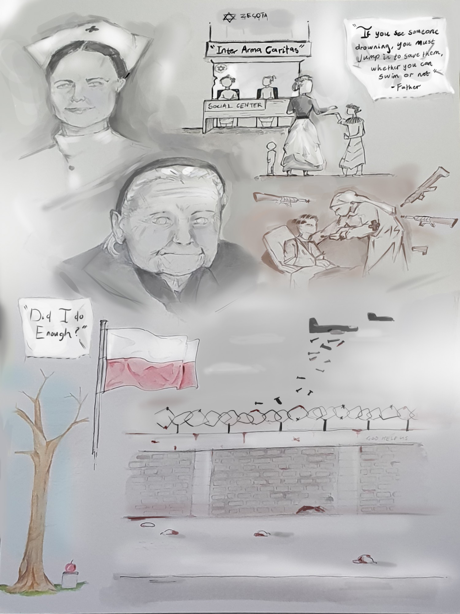 Excerpt from artist’s Impact Statement: "[Irena Sendler] saw the fear and pain in the lives and situations of people and used her position to help and provide them with a better existence, a better life. I can only imagine the extreme highs and terrors she felt sneaking the children out of the hells known as ghettos, knowing that at any second, she could be caught and executed."