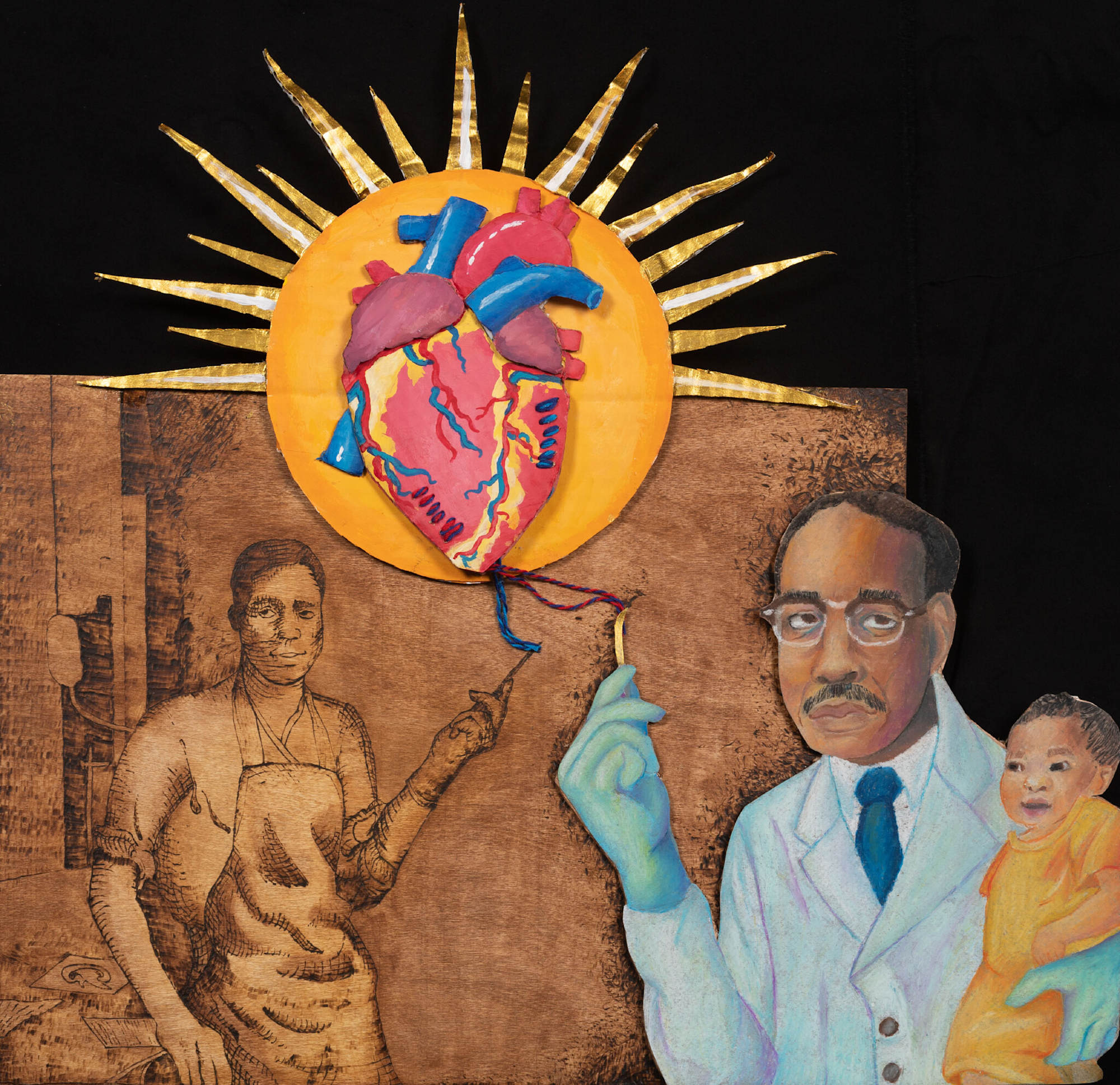 Excerpt from artist’s Impact Statement: "The vision behind my piece was the expression of the lifesaving work he did in both his youth and old age...In one hand, Thomas can be seen holding a needle connecting to a heart above his younger and older self. The two vastly different media represent the changes in time, but they still connect to his life’s work: the heart."