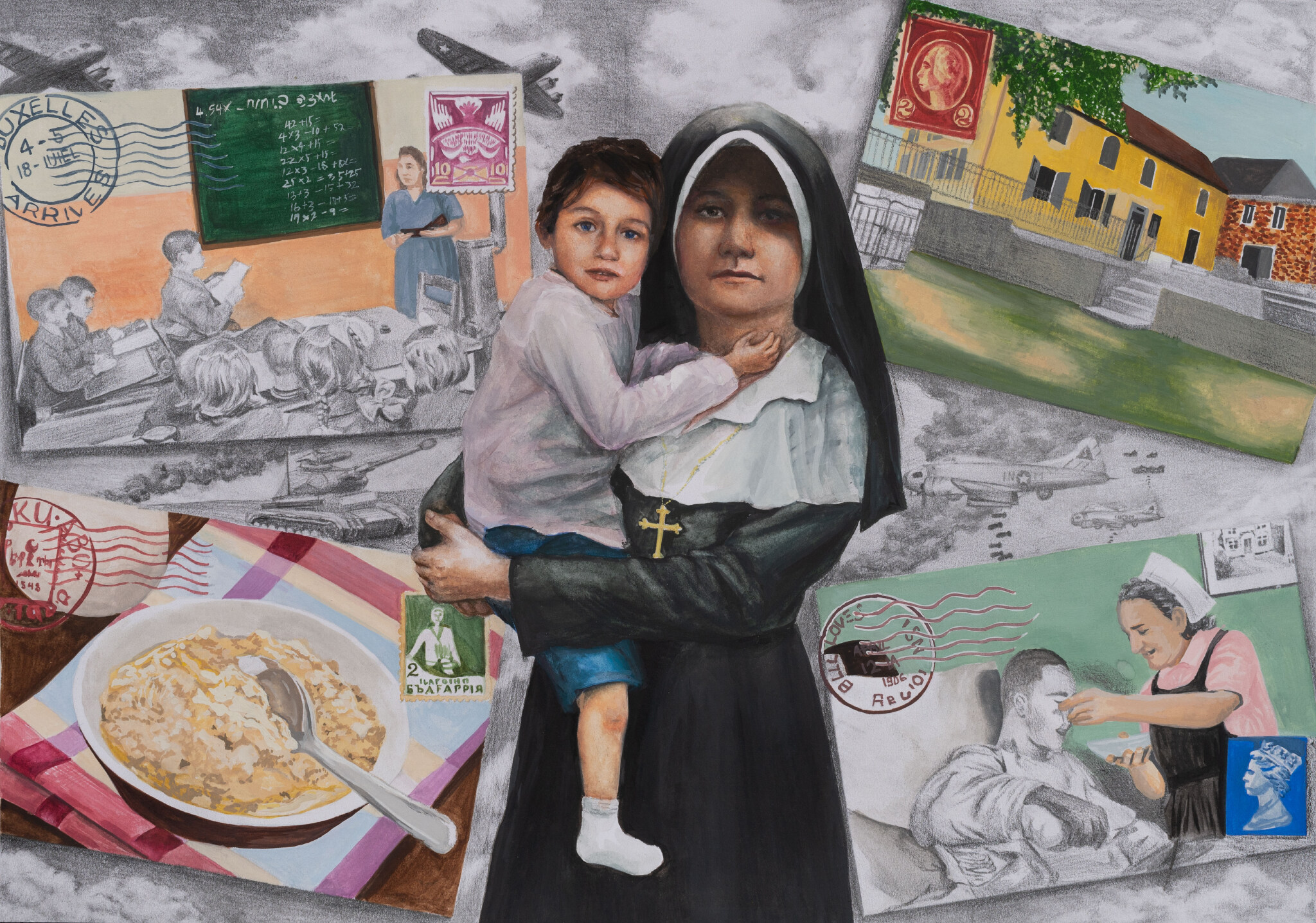 Excerpt from artist’s Impact Statement: "The central focus of the artwork is Matylda herself holding a Jewish child in her arms, standing strong and resilient. Her facial expression shows both strength and vulnerability, which, although not directly visible, reflects the inner turmoil of someone burdened with a great amount of responsibility. Through this intricate portrayal of her, I sought to symbolize her commitment to protecting and nurturing those in need, even in the face of great danger."