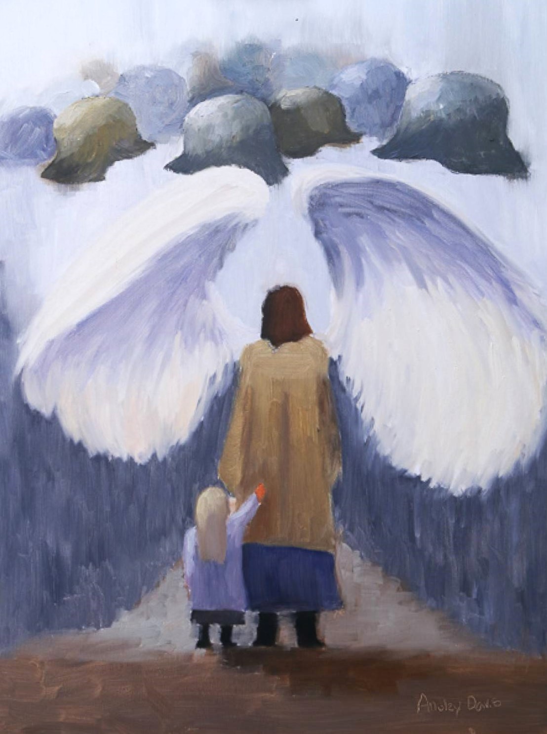 Excerpt from artist’s Impact Statement: "In my painting I decided to illustrate Meva with angel wings spread to guard Inka as Inka clings on to Meva's coat. Ahead of them lies war helmets and a dark and unsure path. Inka is looking up at Meva who seems to be guiding her forward. This painting shows how Meva guided and protected Inka from the danger of the Nazi."
