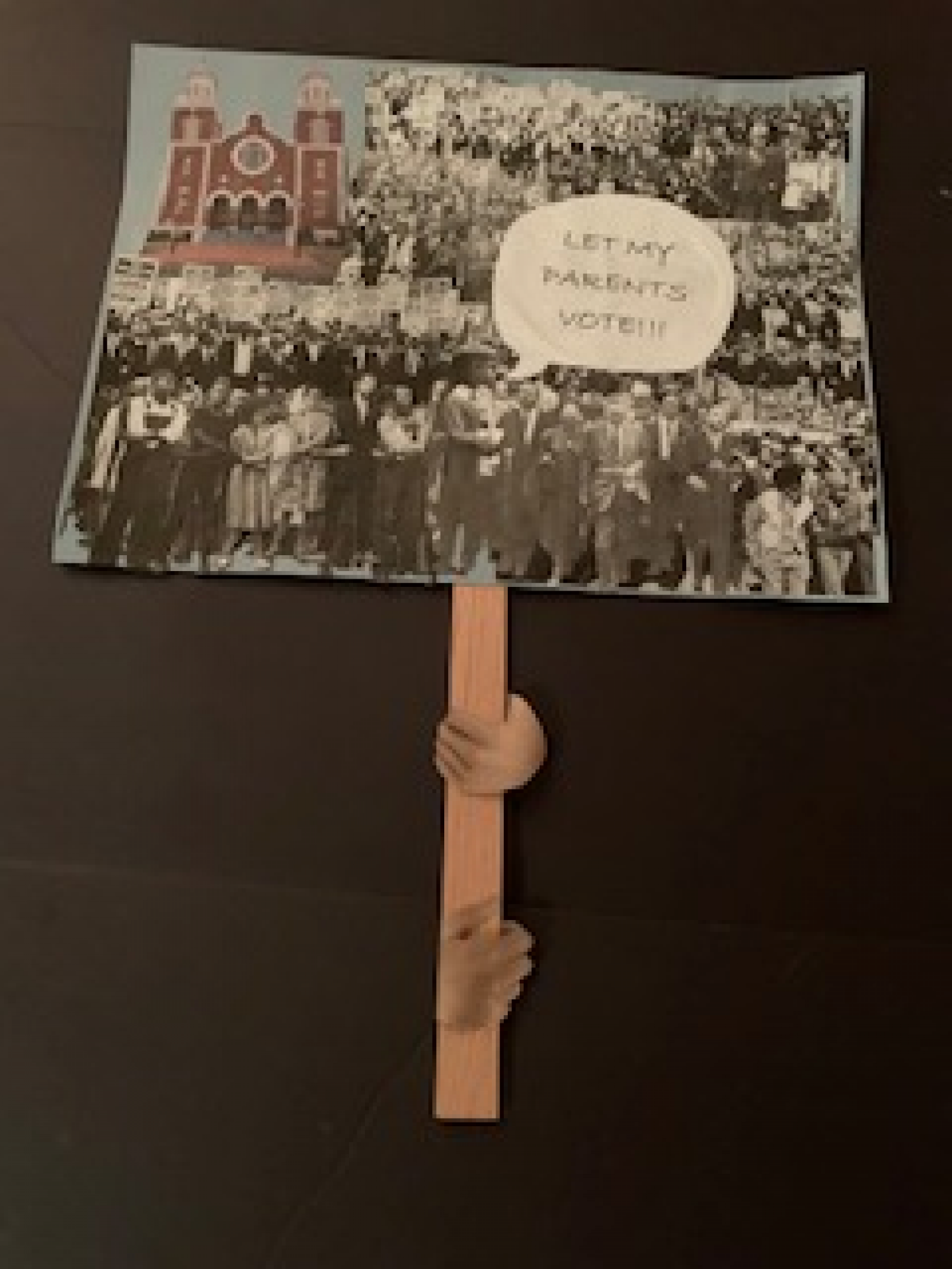 Excerpt from artist’s Impact Statement: "I chose to portray my story about Sheyann Webb as a protest sign. It shows her message and her small hands holding the protest sign. The speech bubble refers to Sheyann Webb's birthday wish, which was to have her parents be able to vote."