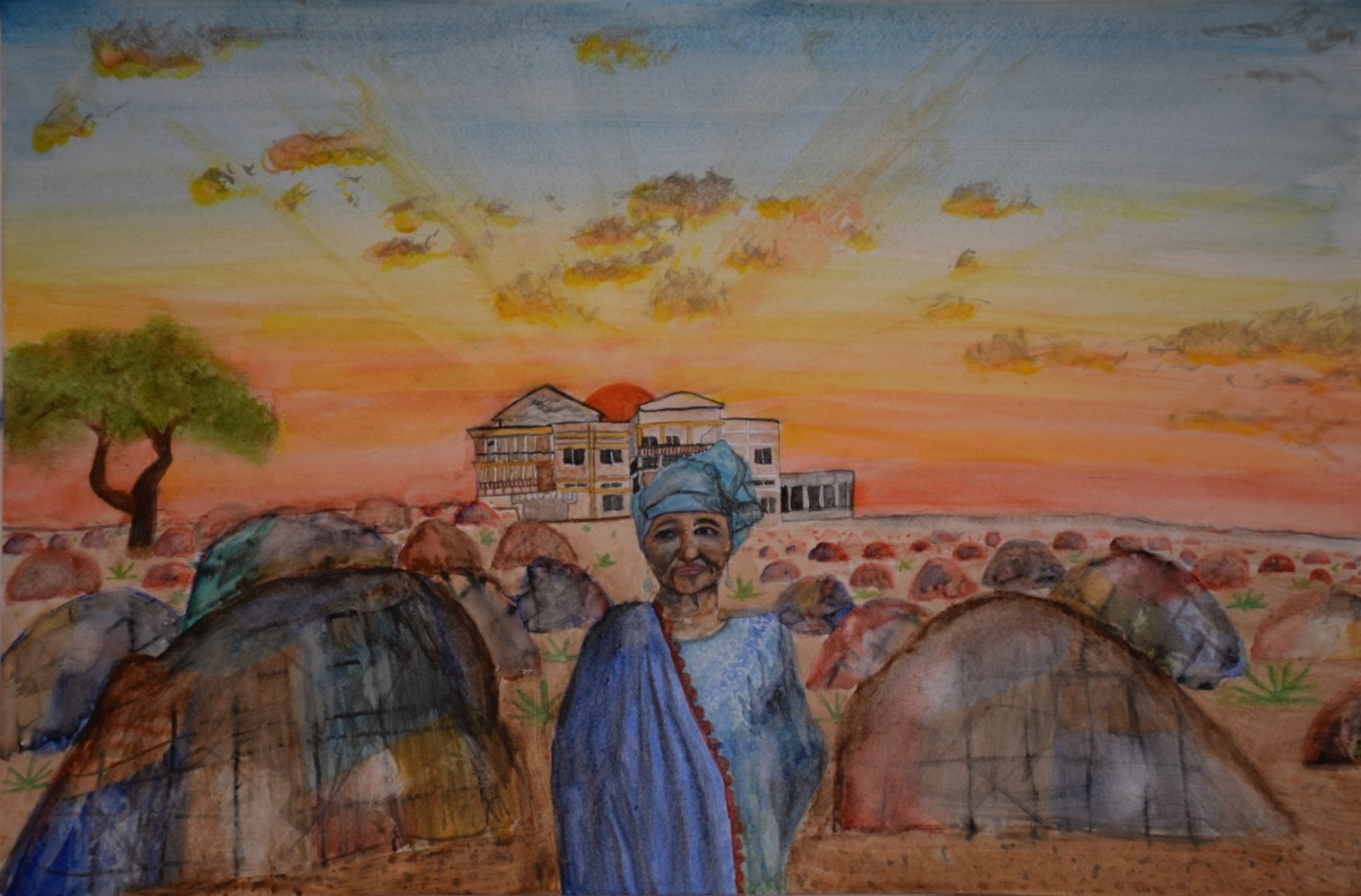 Excerpt from artist’s Impact Statement: "My desire for my painting was to portray Hawa’s life and heart; which was in her work. Her dress and scarf are sky blue to set her apart from the largely warm-colored background, which signifies her peace-spreading leadership within the camp."