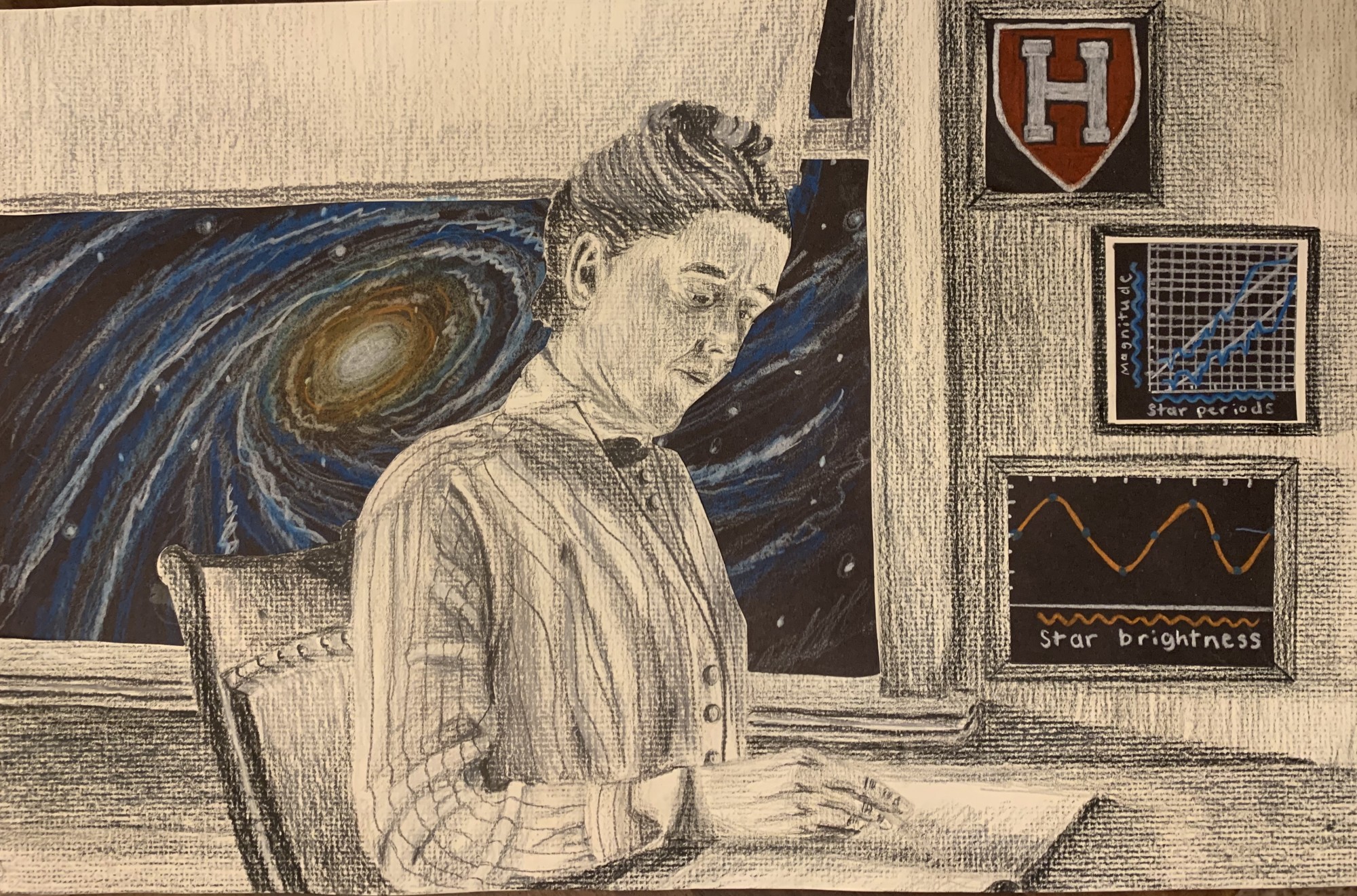 Excerpt from artist’s Impact Statement: "The most prominent thing in the piece would be the galaxy in the background. I chose to incorporate this because her work was able to help so many astronomers map galaxies in the future."