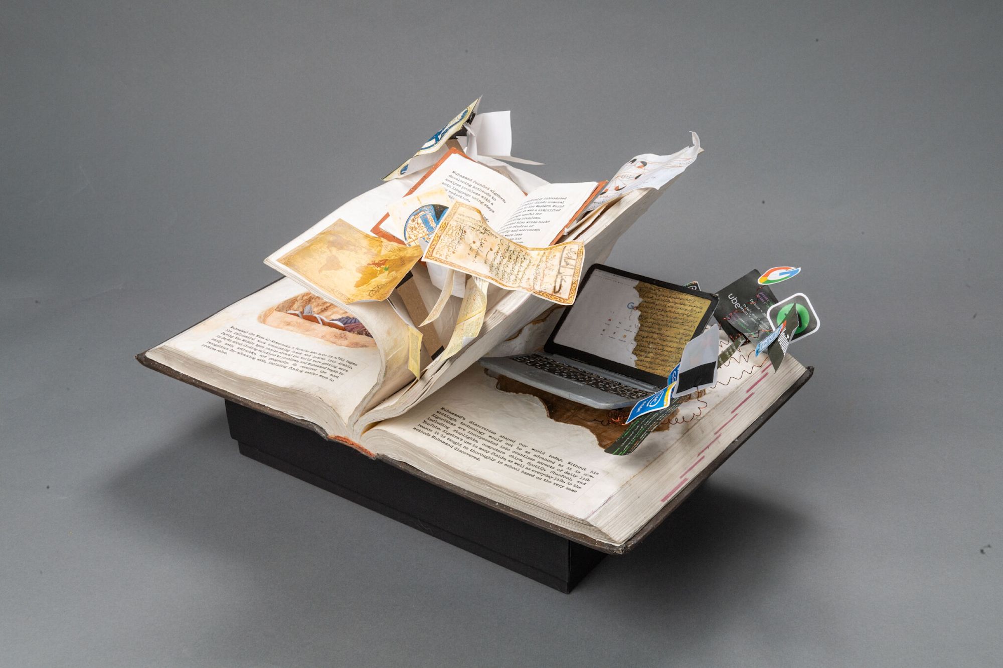 - A college accounting book from 1998, epoxy sculpt, various glues, acrylic, joint compound, paper, electrical wire, electrical tape, chip board, fairy lights, tin foil, clear plastic, pencil, pen, polymer clay, watercolor, instant coffee.