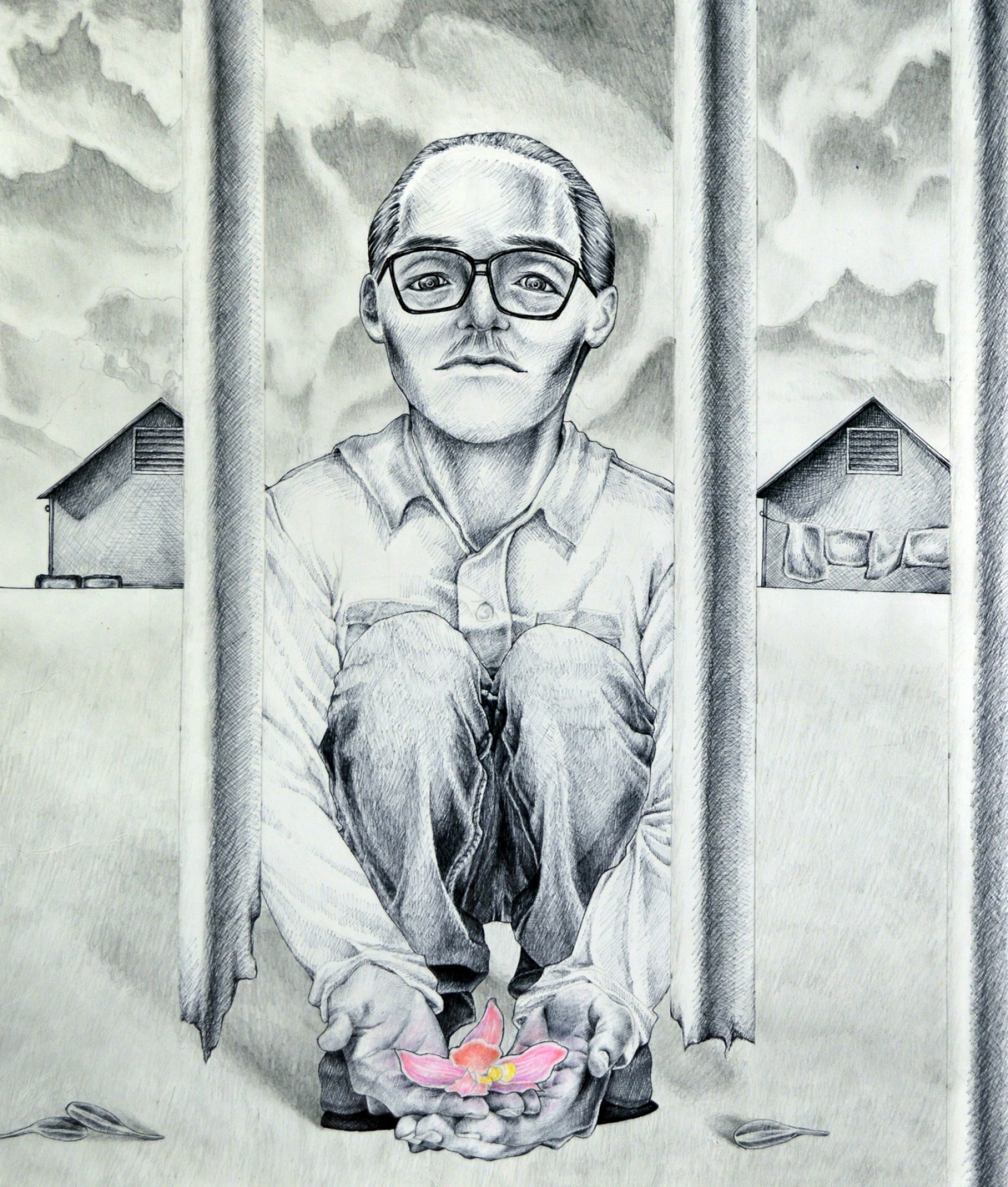 Excerpt from artist’s Impact Statement: "The lack of color present in the piece represents wanting to create an old-timey aura and the depressive state that everything and everyone was in back then. Additionally, the remaining orchid seeds on the ground depict the unattained objectives of previous proponents like that of Yasui and the hopeless state of minds of the people in the internment camps."