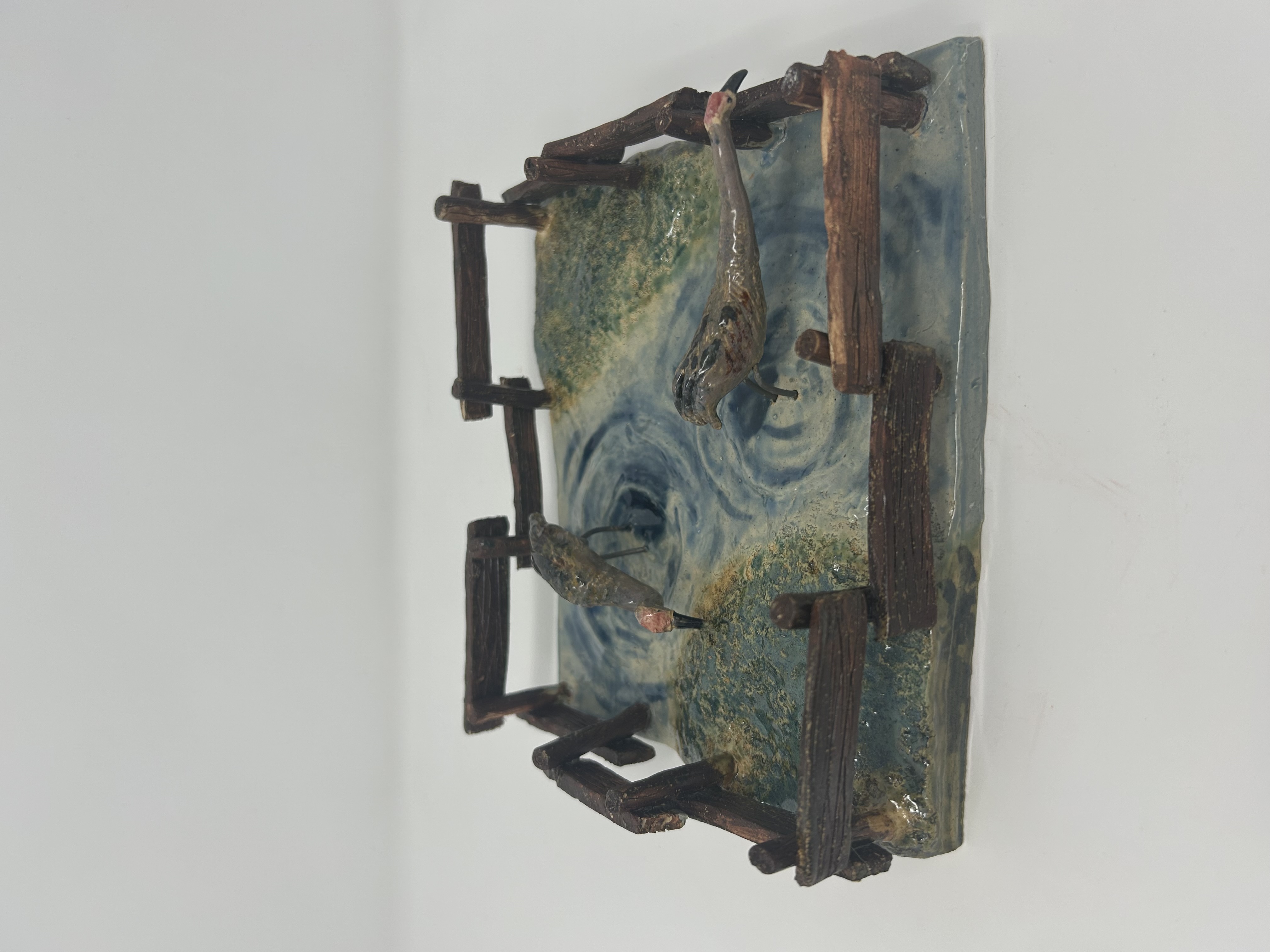 Excerpt from artist’s Impact Statement: "In my piece, there are cranes inside of a fenced enclosure in their natural habitat. Although, it’s a little counterproductive to put a fence around birds that can fly, it’s intended to convey that Jacob Valentine wanted the crane safe and secure, keeping a close watch to preserve the species."