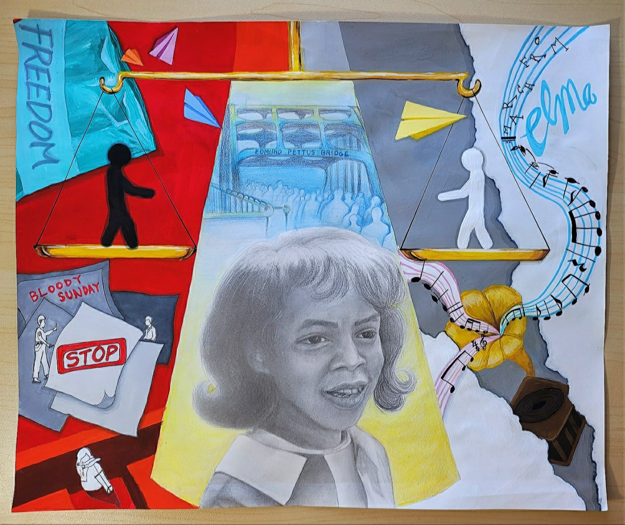 Excerpt from artist’s Impact Statement: "I realized how this took place awhile back, but is still happening today. Yes, things have changed, but still not enough. Many more acts are going to take place if things don’t start changing for good. There shouldn’t be a line dividing people’s race and everybody should have their voices heard. Everybody should have freedom and equity."