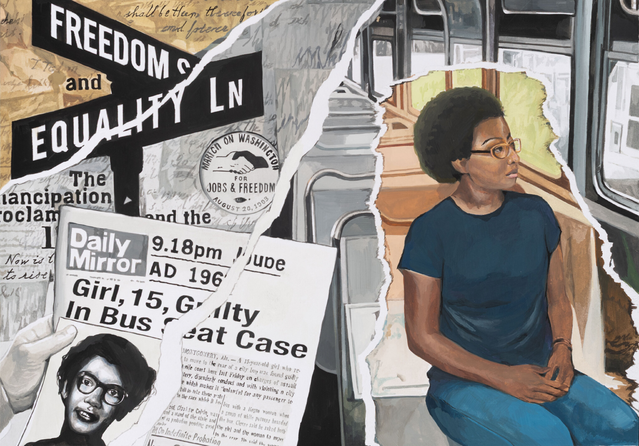 Excerpt from artist’s Impact Statement: "When I was planning my artwork, I wanted to show how Claudette’s story was torn apart and almost forgotten by history. I chose to use a collage style, with ripped paper effects, old newspaper clippings."