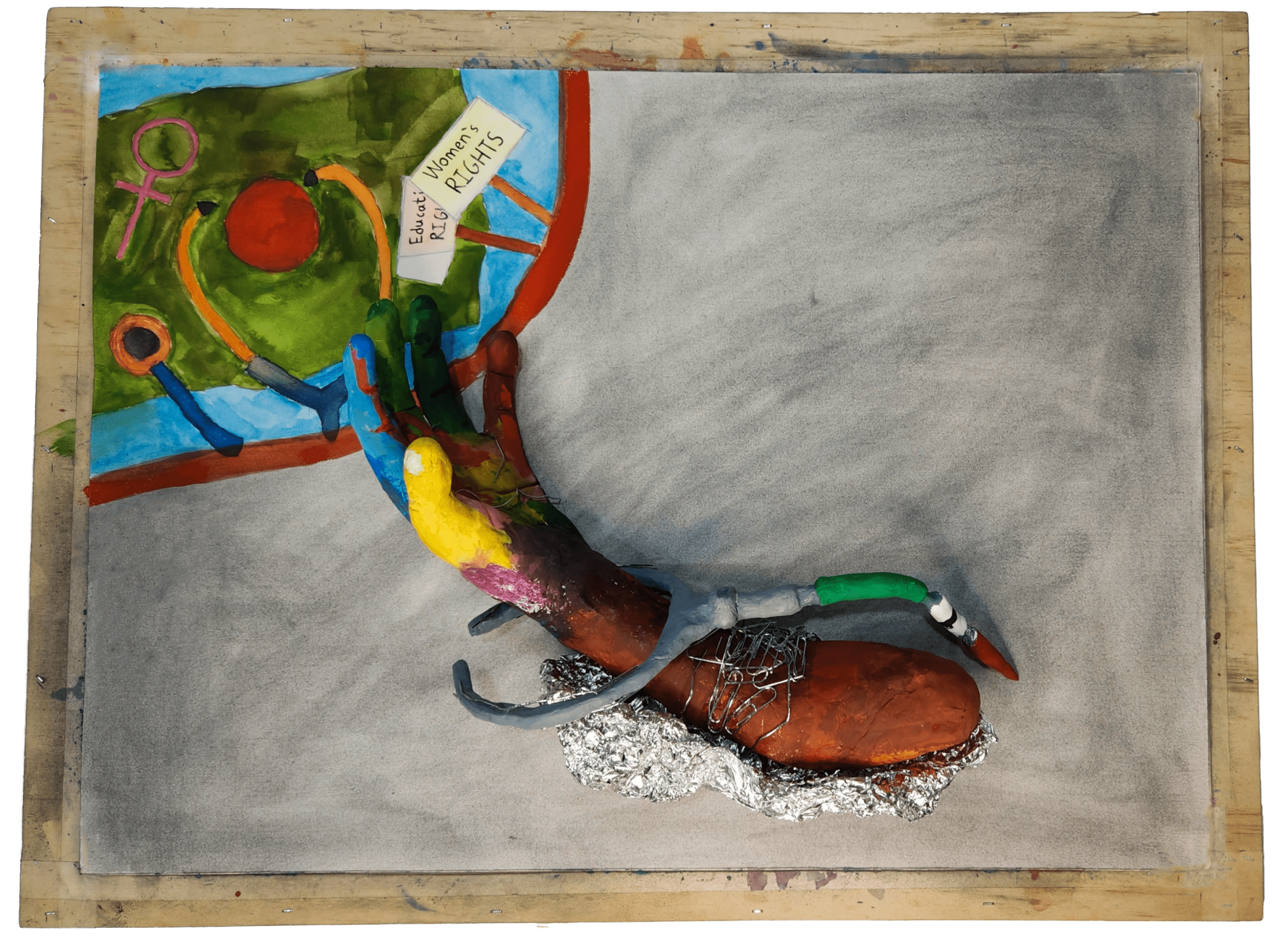 - Watercolor, charcoal, air-dry clay, foil, wire, paper clips.
