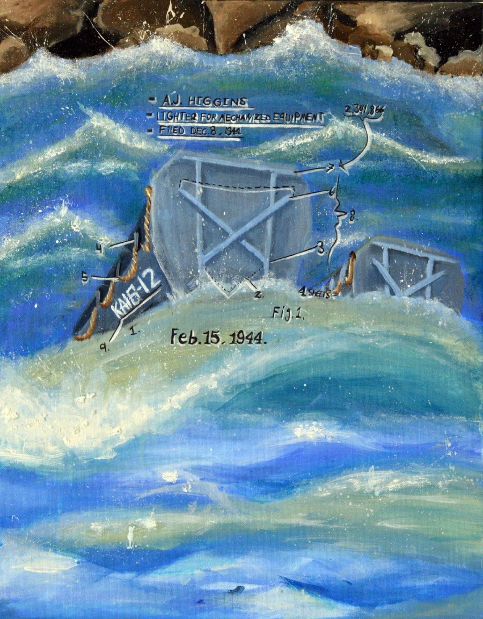 Excerpt from artist’s Impact Statement: "For my unsung hero project, I wanted to show Andrew Higgins boats in action. I put two boats side by side riding over crashing waves on the way to Normandy. I stuck waves crashing on rocks in the background to show the choppy waves."