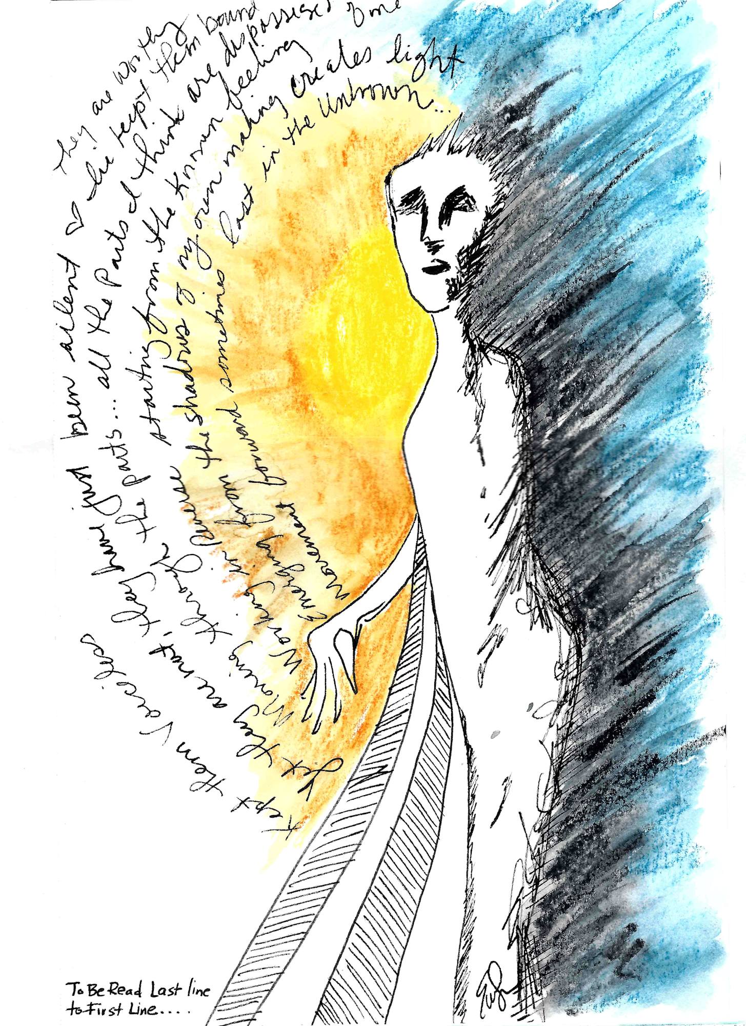Content: (small note on bottom: to be read last line to first line) Movement forward sometimes lost in the unknown... Emerging from the shadows of my own making creates light. Working in reverse, starting from the known feeling, moving through the parts... all the parts I think are dispossessed of me. Yet they are not. They have just been silent <3 I've kept them bound. Kept them voiceless. They are worthy.
