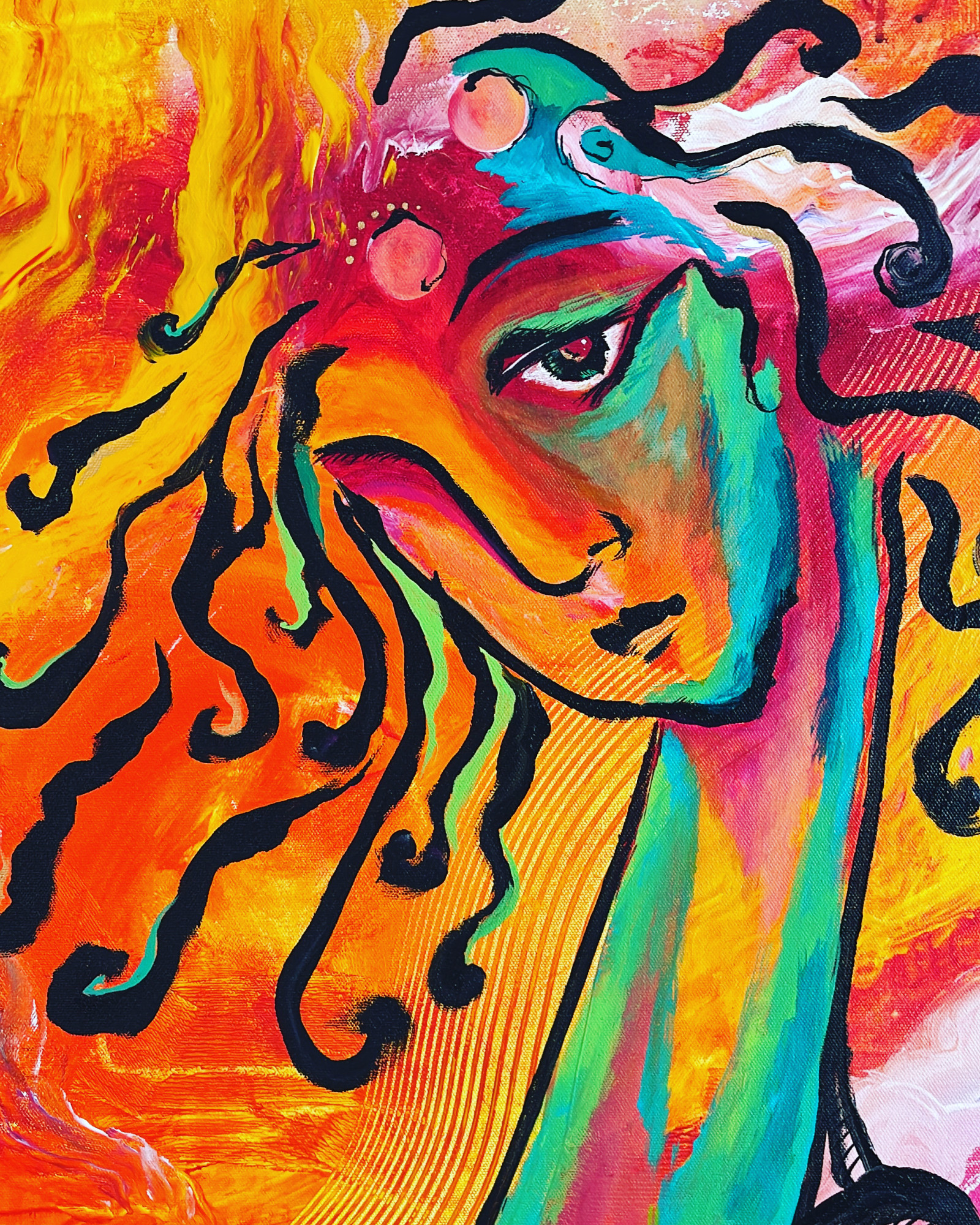 I’m feeling very attached to the conversation she is having with nature, the softness of her gaze, the quiet of that moment. This is one of the unique paintings that start with my hands and fingers before the brushes find their place. This process happens when I need movement, and I long for a space that allows me bigger canvases.