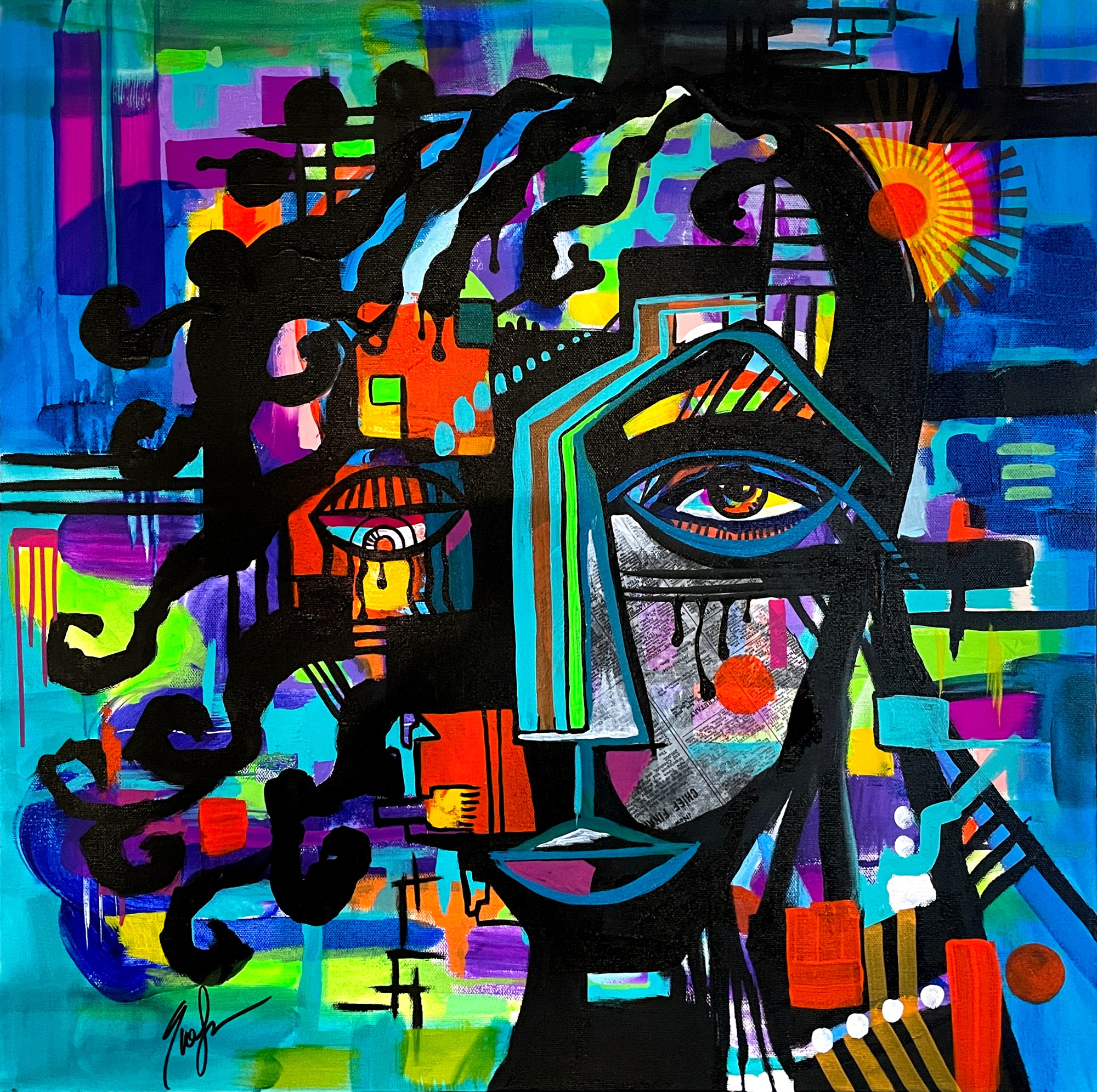 The subconscious mind is incredible in the process of painting and allowing creativity and healing to flow. It has been a tremendous few years, blended with heart break and health issues, a surge in creativity and expansion, healing and love. It took a friend to point out all the subtle symbols of these things; my asymmetrical hair, right eye vision issues, concussion, thyroid scar, and still the bursting inner sunshine that remains with me regardless of what I am feeling. This piece has started quite a few conversations with friends, all of whom have immediately assumed it to be a self portrait. This is #1 in the Self Portrait Series