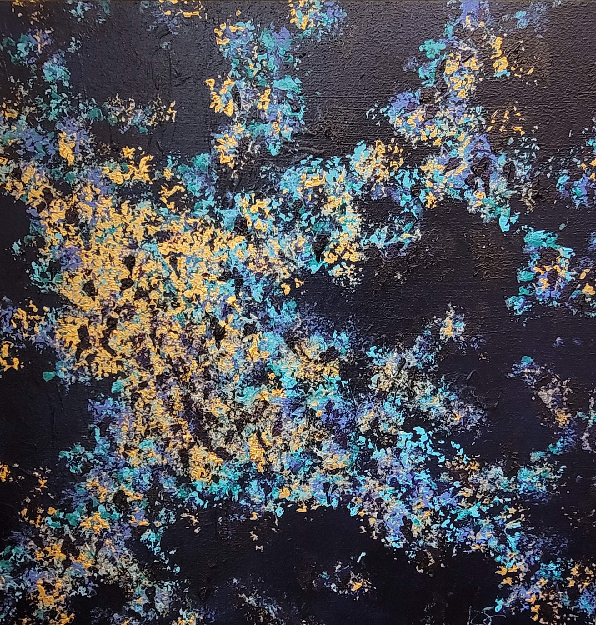 Deep blue with shades of gold and turquoise accents swirl in quiet movement.