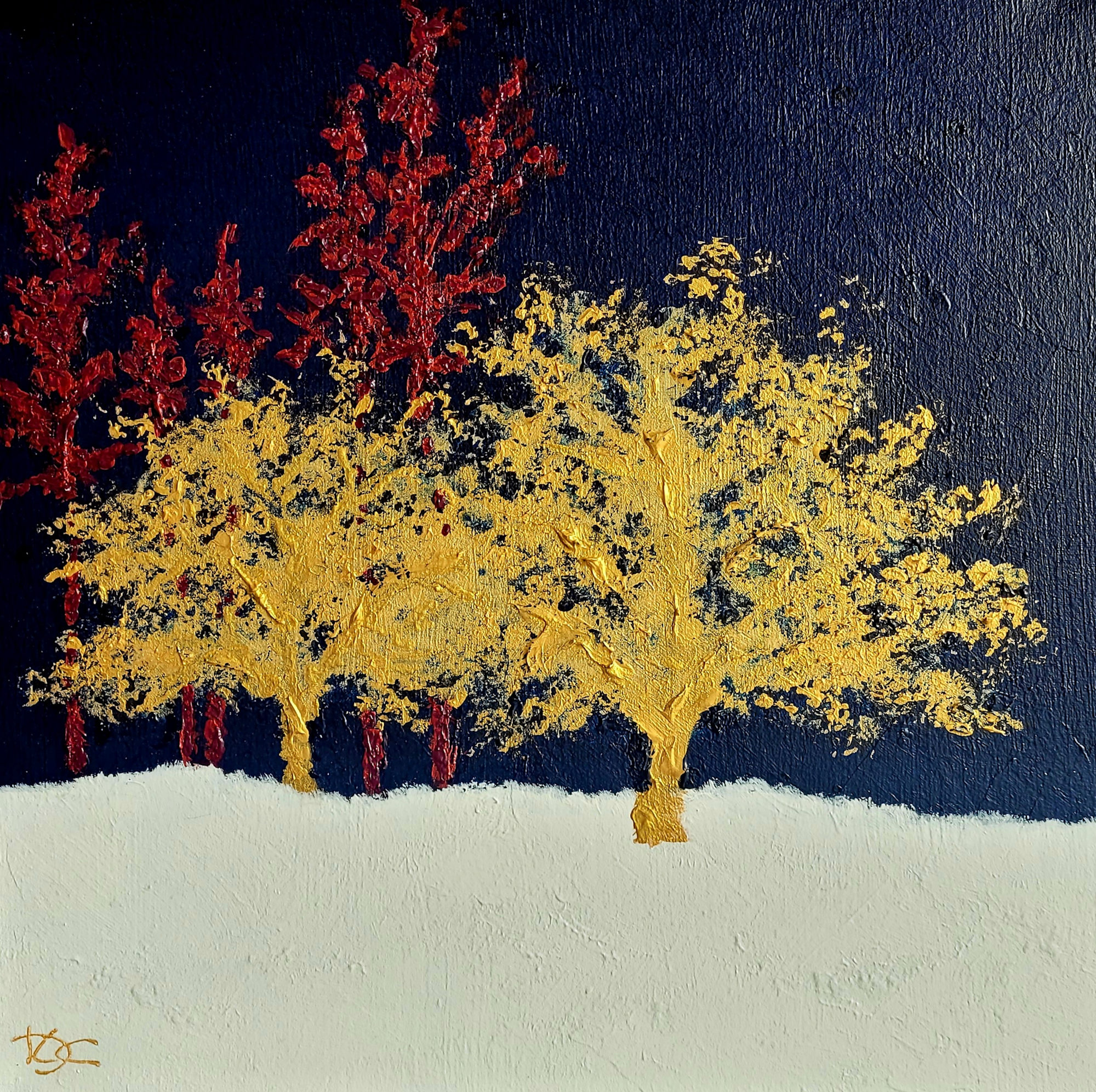 Asian influenced simplistic trees with snow at night. Simple. Still. Calming. On a smaller scale.