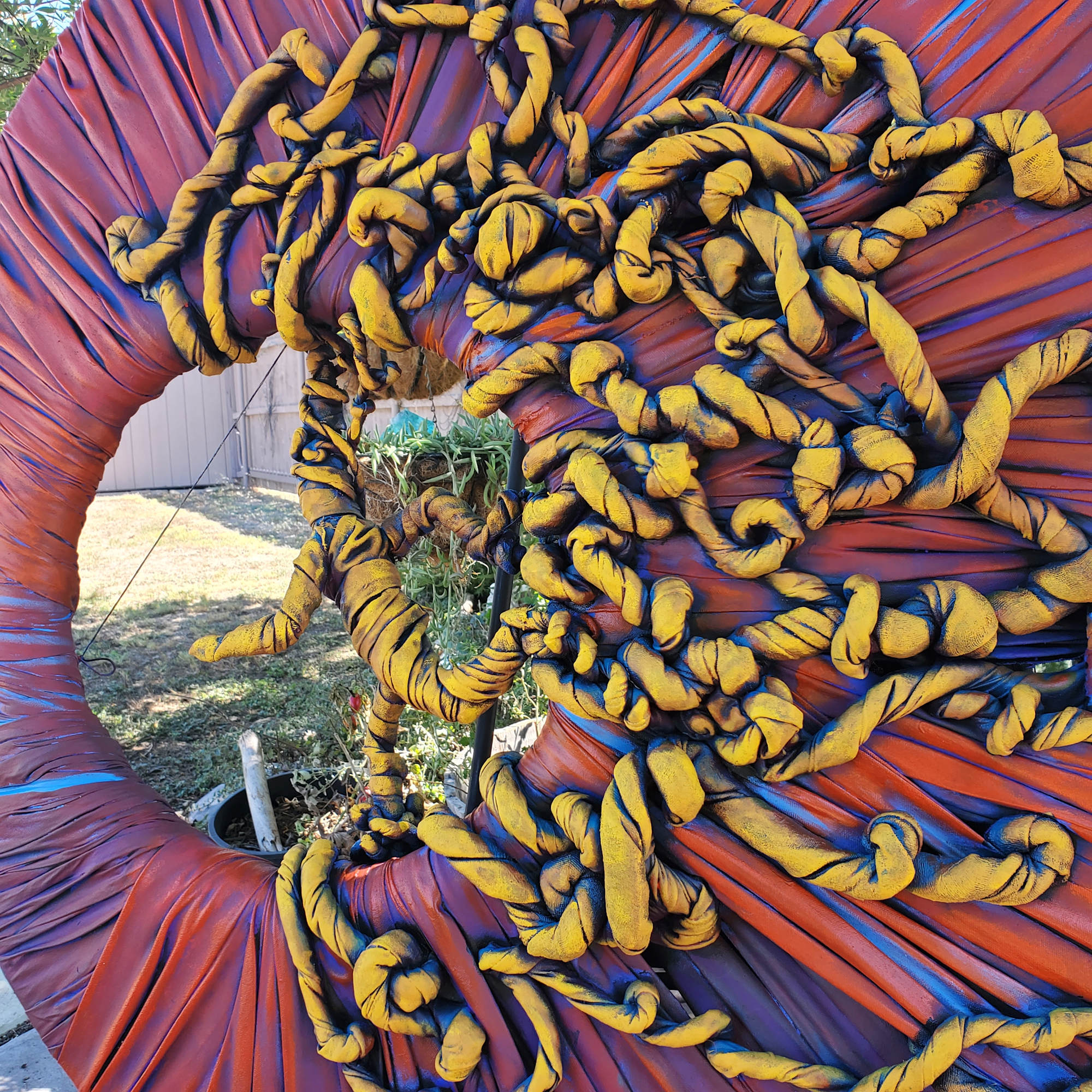 - Wall sculpture of upcycled and painted fabric entangled on a custom frame