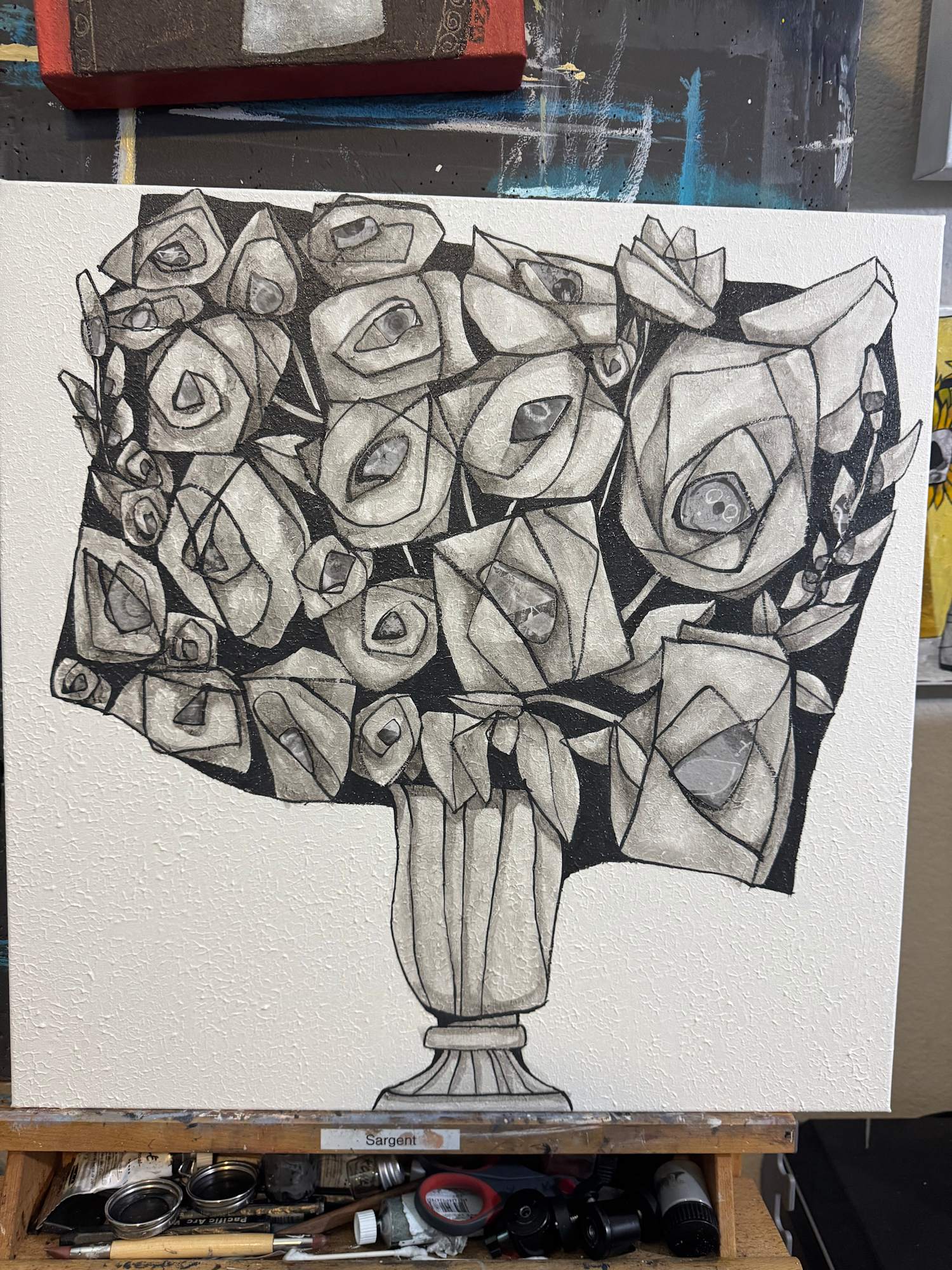 My painting, Roses 2, uses vibrant colours to mask darkness, reflecting how beauty and hardship often exist together. Like the textured surface, life can be difficult, but we can always add colour and improve our circumstances.