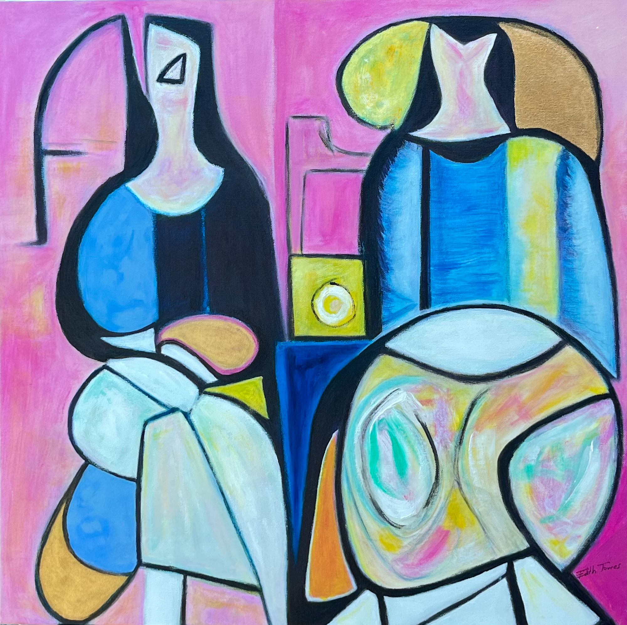 In this composition, the figures emerge in a palette of soft pinks, luminous yellows, and pale greens—colors that evoke renewal, warmth, and emotional clarity. The geometric forms remain fragmented, yet the overall atmosphere feels gently expansive, like a garden of connection unfolding in silence.
