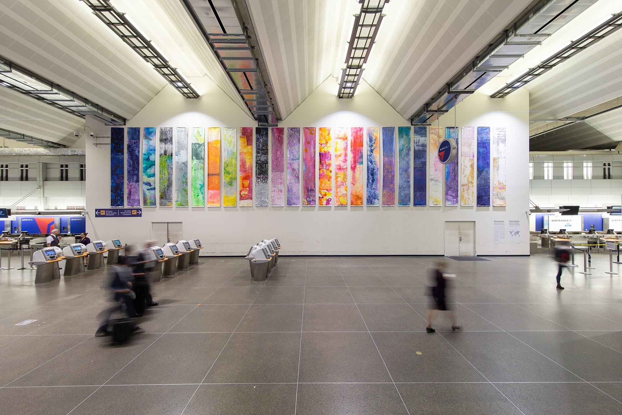 122 Conversations is a culmination of the artist’s six-year, world-spanning pilgrimage to utilize cross-cultural exchange as a means for positive change. This undertaking resulted in 70 largescale sculptural scrolls derived from 60 interviews with people from six cities across the globe – including Thunder Bay, Canada; Duluth, Minnesota; Växjö, Sweden; Petrozavodsk, Russia; Rania, Iraqi Kurdistan; and Ohara Isumi-City, Japan. Labovitz manifests these conversations with graffiti-like text lines, each mark individually created as a response to the revelation that personal experiences create global connections. The individuality of this approach reflects the intimacy of the interview topics: generosity, friendship, reciprocity, community building, and emotional exchange. The addition of color is representative of Labovitz’ established practice as a painter and printmaker, an intuitive response to conversation embodied in formal elements of composition and contrasting tone. These elements culminate in a metaphor of our hopes, dreams, love, and connections in seemingly endless scrolls. It is the artists aim to unite her audience through a common experience, one that humanizes us through the process of seeing and listening. As you fly off to your destination, you are encouraged to consider: What connects you to humanity and how will you express this connection?