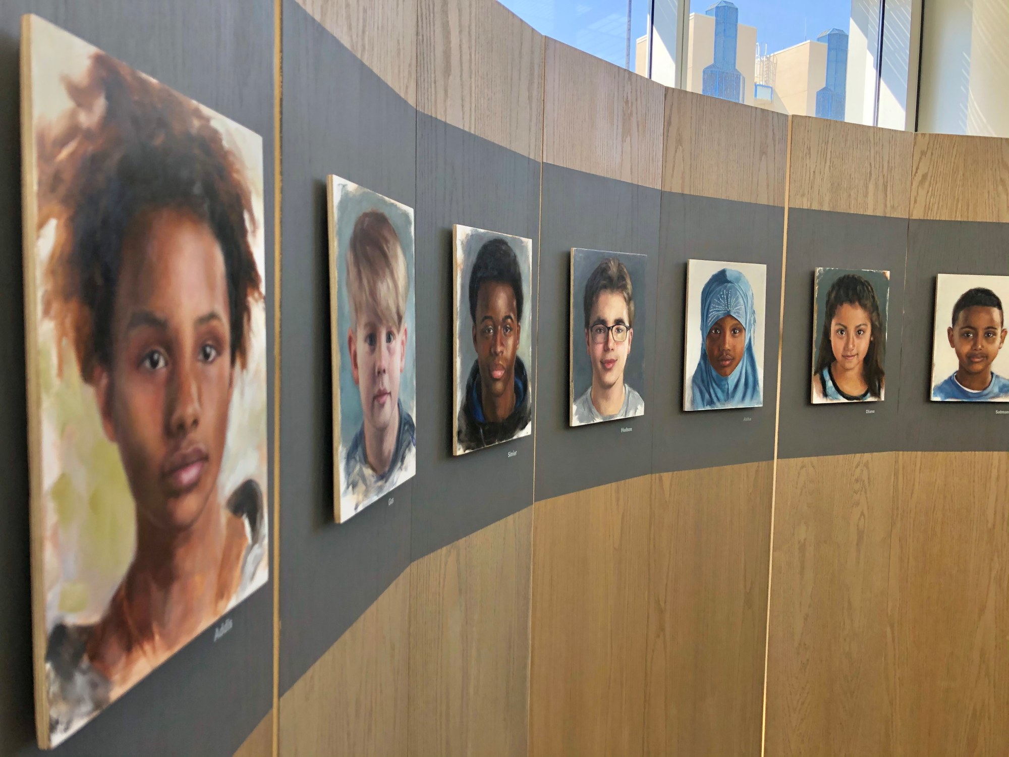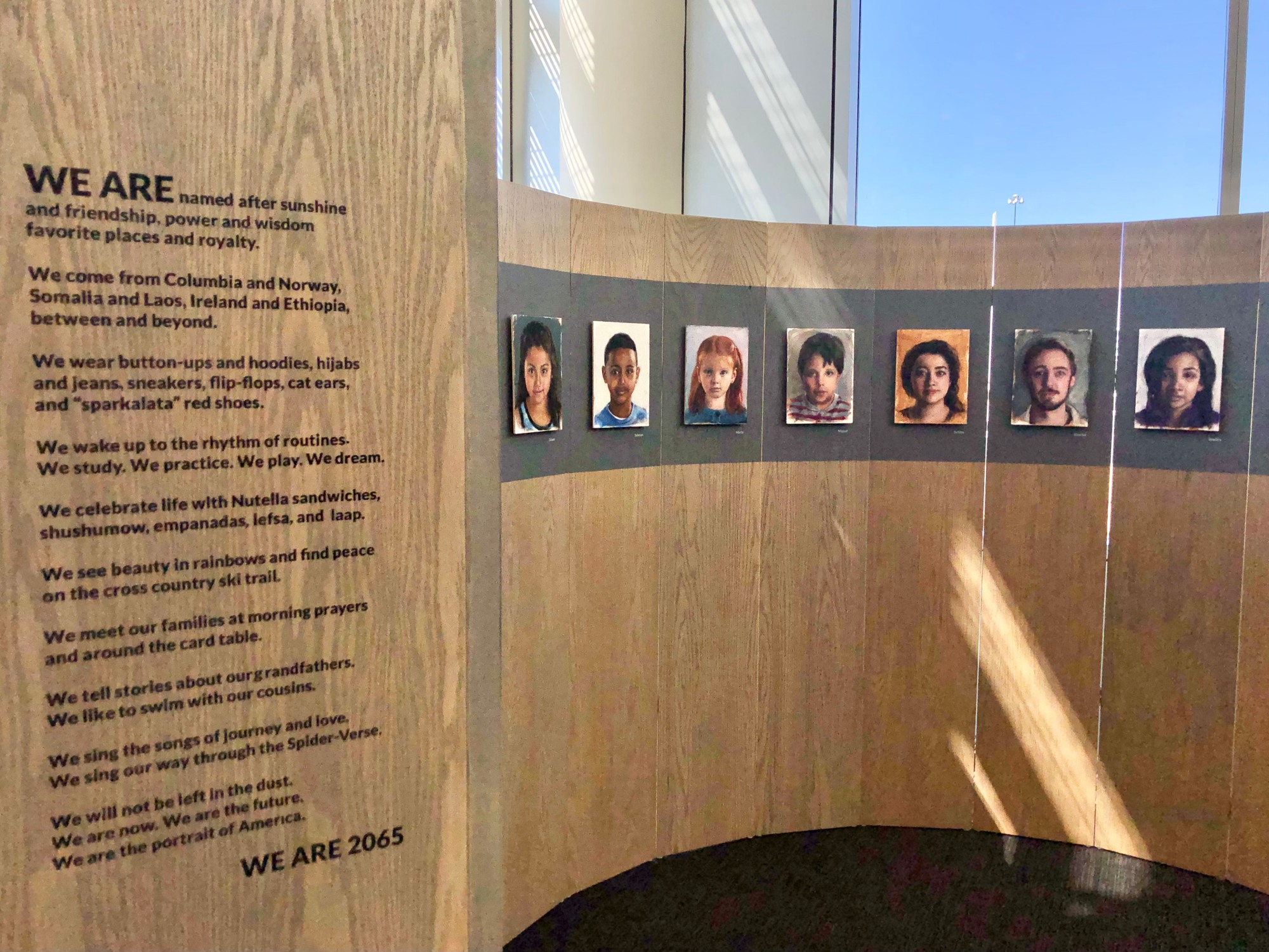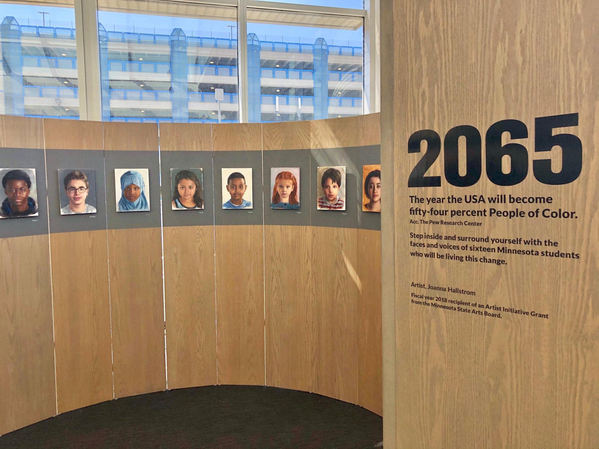 The USA will become 54% People of Color in the year 2065, according to Pew Research Center projections. Artist Joanna Hallstrom presents 16 oil portraits of Minnesotan students who will be living this change, presented with a soundscape of students telling their stories. The semi-circular display combines image and sound to engage travelers with a future demographic.