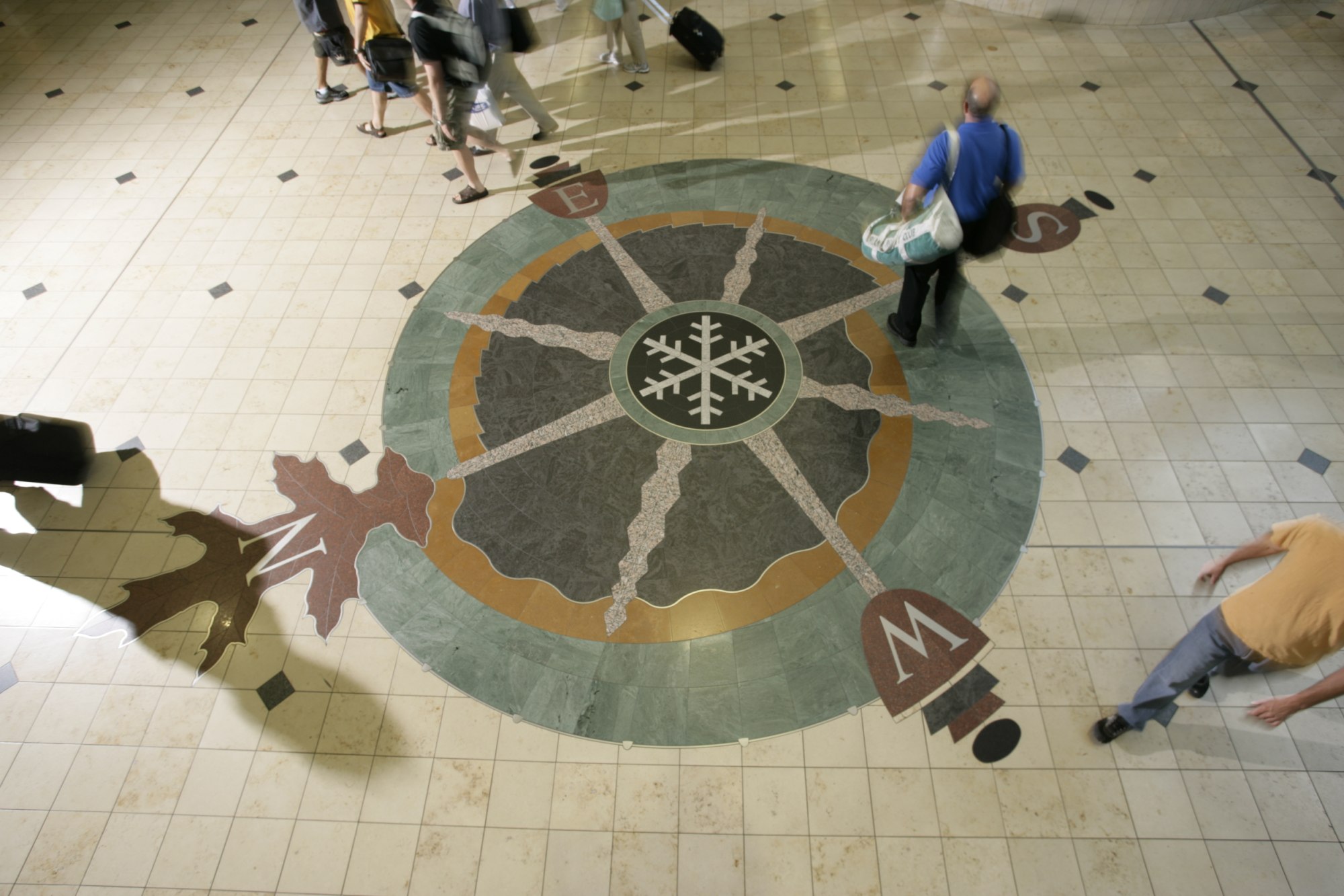 "Minnesota Compass Rose" is part of "A Boreal Triad," located in MSP Terminal 1 and consists of three inlaid stone floors entitled "Minnesota Compass Rose," "The North Star," and "Plant, Animal, Season." All three designs are aligned to magnetic North and were installed in 1999.