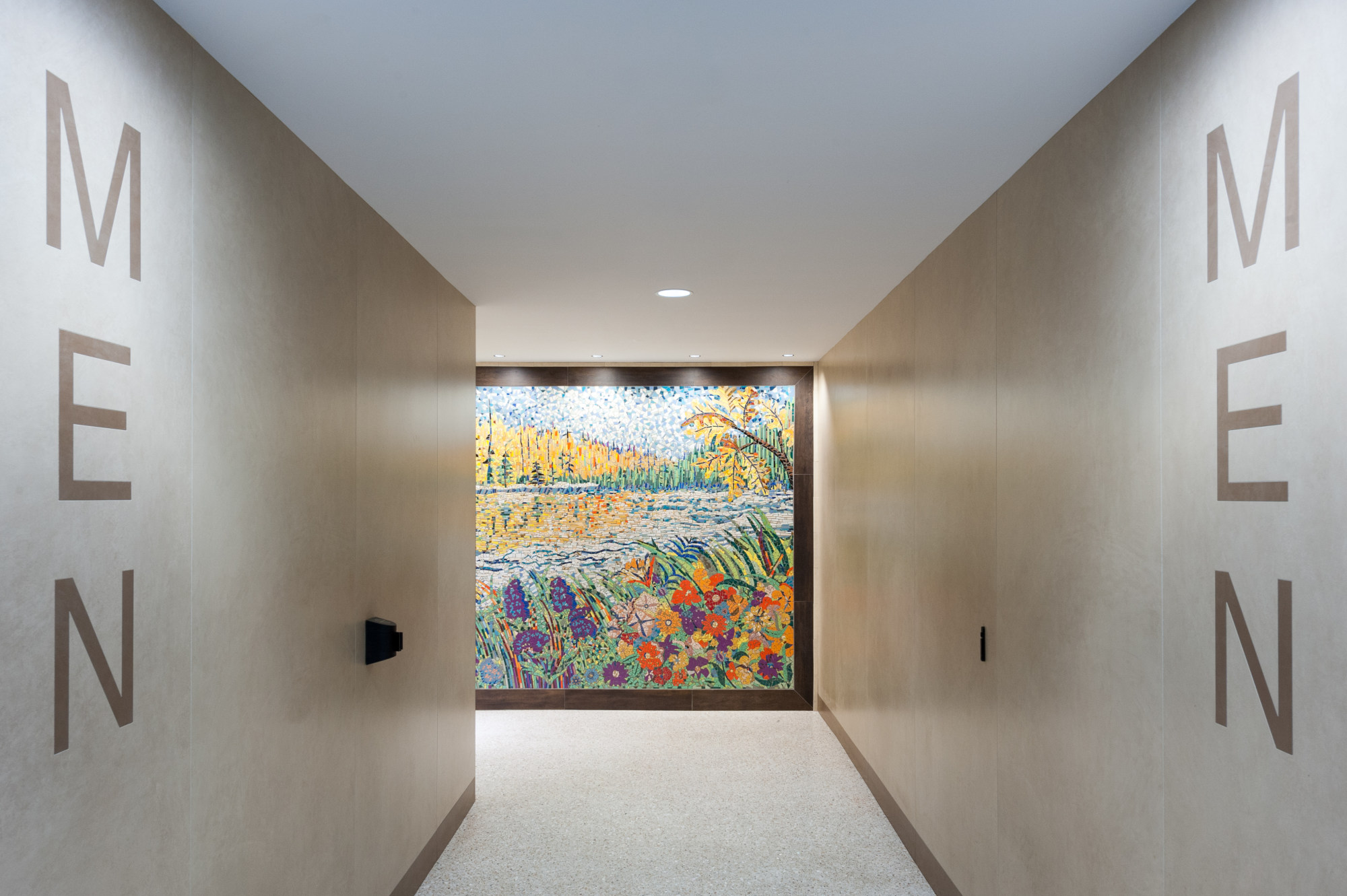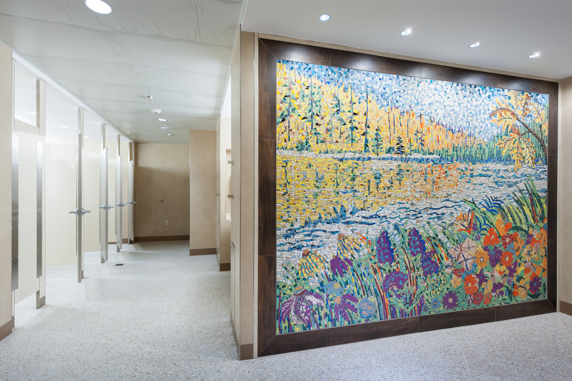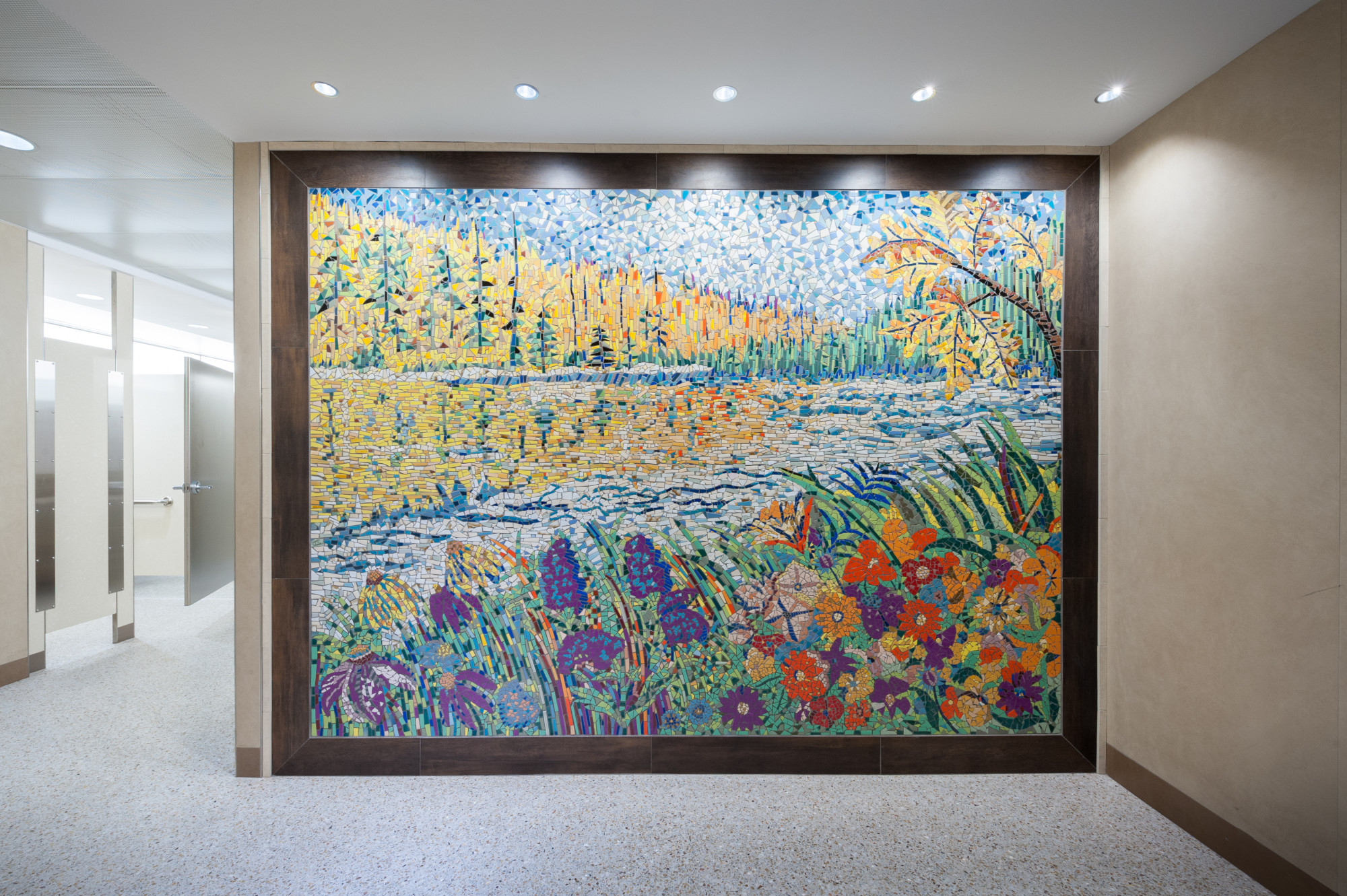 As a Minnesotan who swims year-round and lives in the city, there's nothing better than swimming in a lake. All summer I'm able to swim at a public beach within minutes of home. Every day the lake is a beautiful sight. For me, going to the lake is the quintessential Minnesota experience. I created this work to greet travelers with flowers and a trip to the lake. Tiles for my mosaic work are globally sourced, selected for color and quality. I work with an indispensable team: Studio MVP Eric Sommers, Carol Zen, Lefty Christenson, and George Hansen.