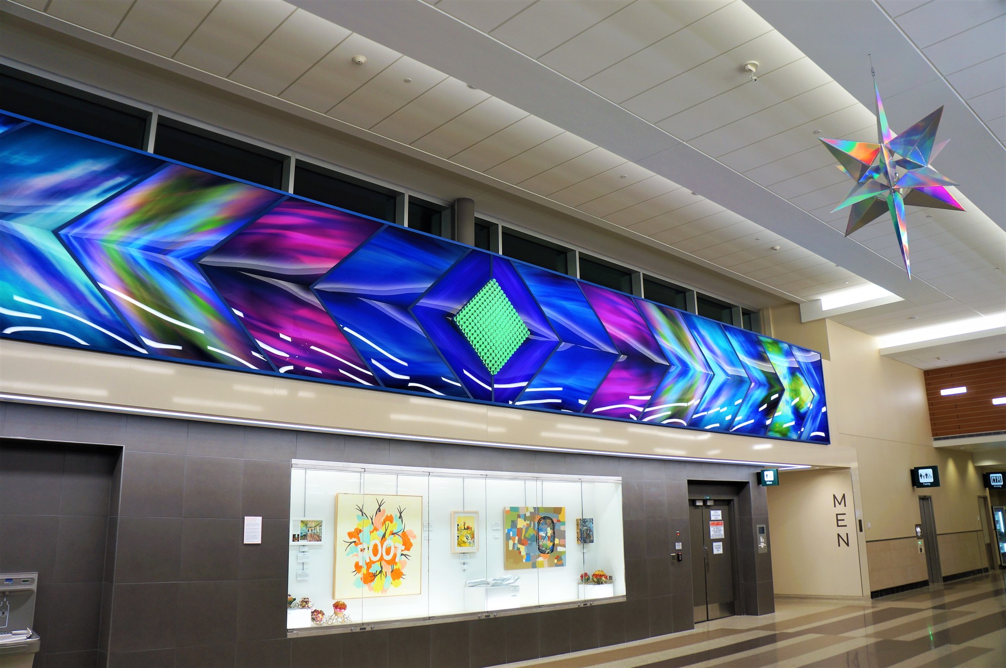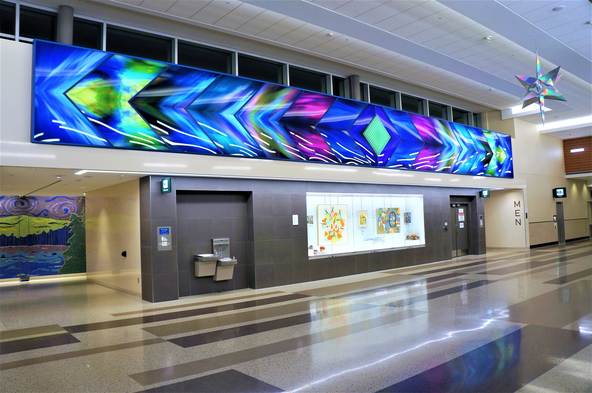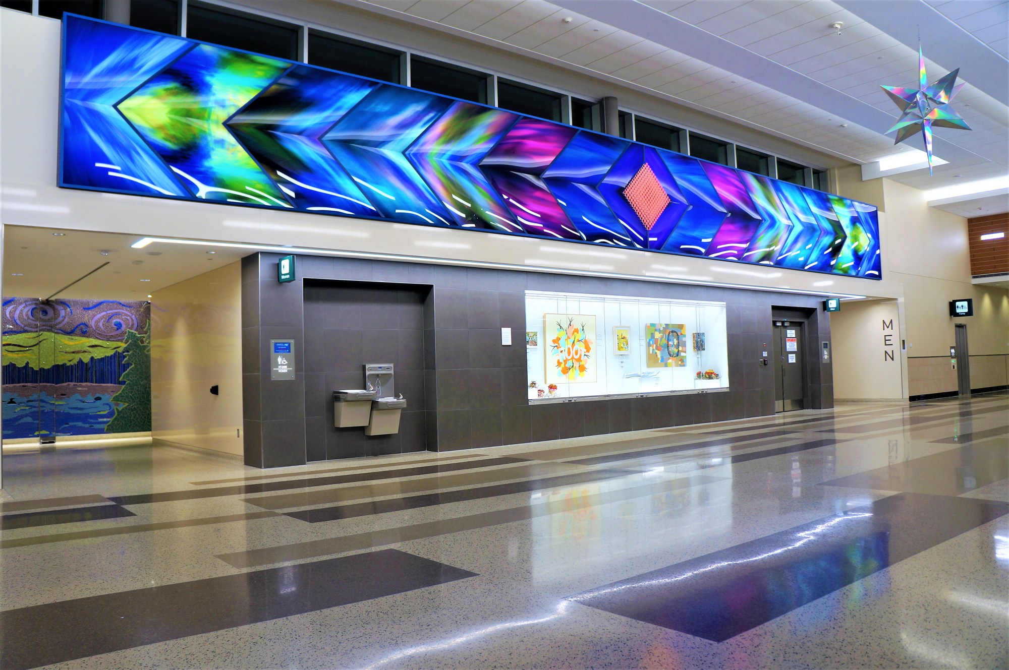 "Aurora Borealis" brings the colors of the Northern Lights to life in the airport. The Aurora Borealis wall is 60 feet long by 6 feet tall. In the very middle of this sixty-foot long series of images is a rainbow diamond made of clear acrylic rods and lit with LED color lights that go through the colors of the rainbow.