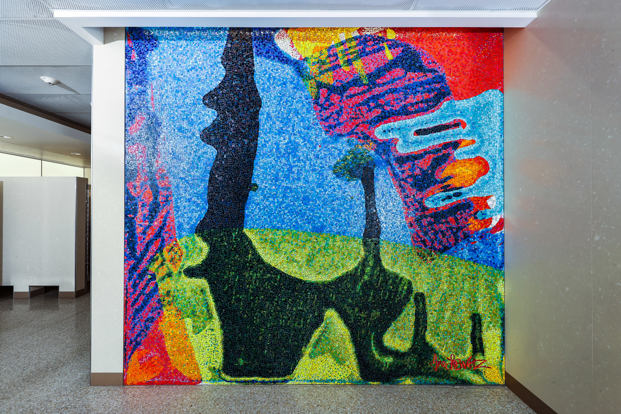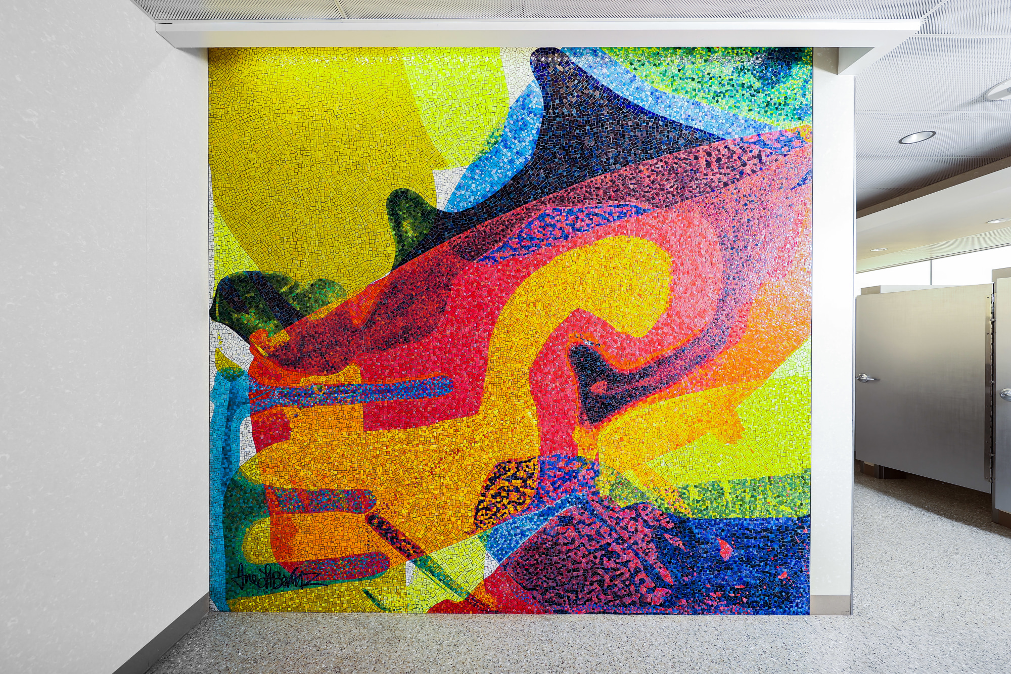 Color is an incredibly personal experience that affects human emotions. Anne Labovitz hopes that the saturated colors used in these mosaics will enrich your travel experience with feelings of delight, joyfulness, and wellbeing. The rich, bold Venetian glass mosaic is elegantly hand-crafted and placed by Italian artisans. Notice how the swaths of color consist of not one but many different tones to create the finished mosaic. This profusion of colors is the dominant theme of this work of public art.