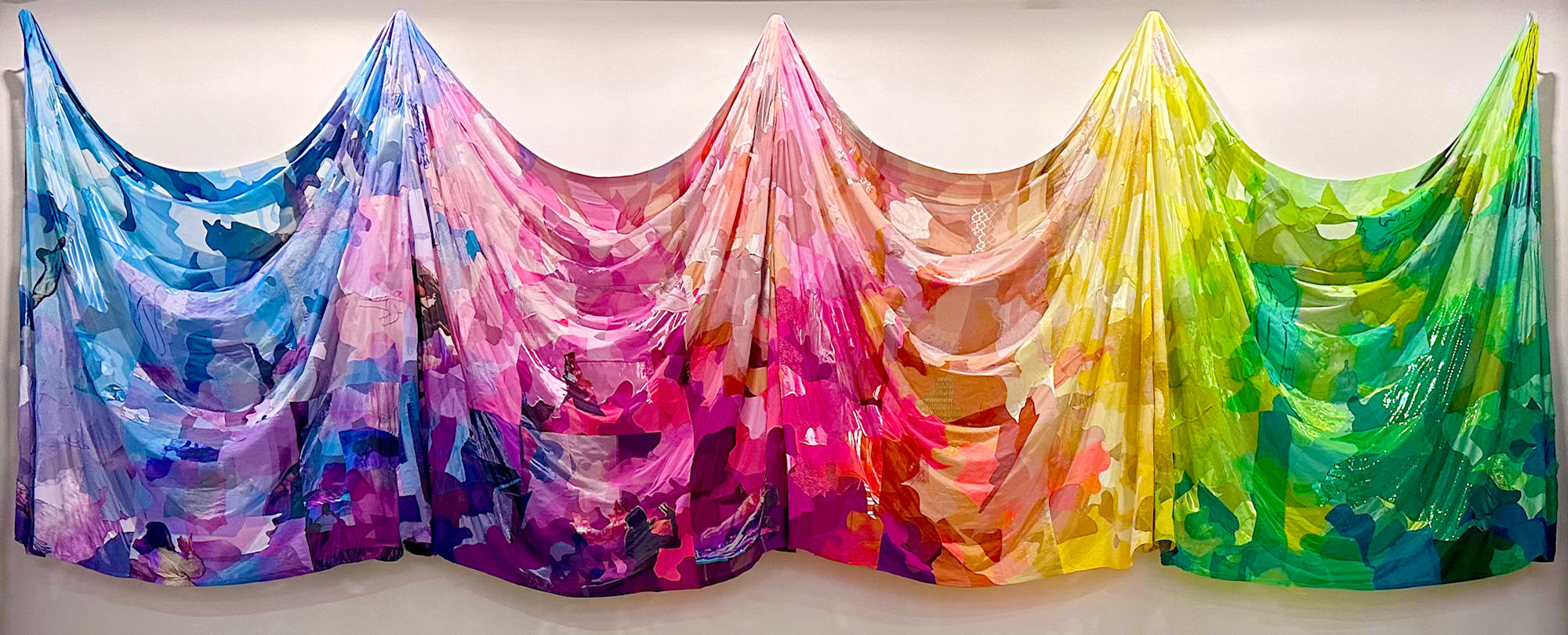 “Chorus” by Minnesota-based artist Alexandra Beaumont honors the freedom and power of the dance floor. A reflection on bodies moving to music under pulsing lights, “Chorus” swirls together layers of color with painted, photographed, and embroidered figures. Each dancer subtly depicted is a family member or friend of the artist, underscoring Beaumont’s focus on community celebration as a source of sustenance and joy. The twelve by forty-eight-foot artwork is comprised of thirty-six squares of hand-sewn textile collages. Beaumont evokes scintillating lights by using various cloths of different lusters, textures, and translucencies, hung loosely to sway in the space. Vibrant abstract colors shift hues and saturation, inviting the gaze to dance across the piece, pausing on an expressive hand or soulful face.