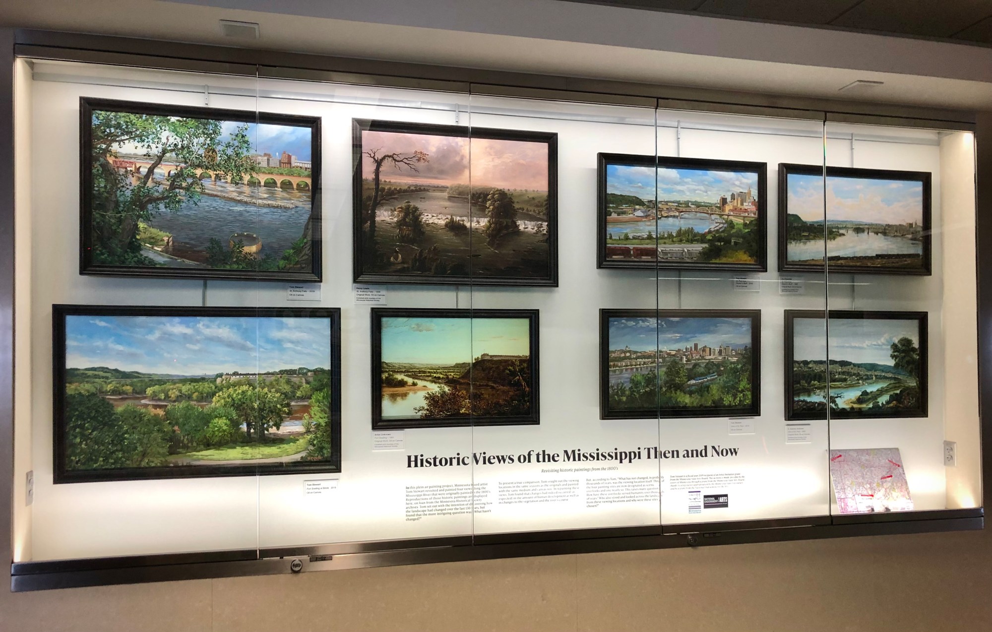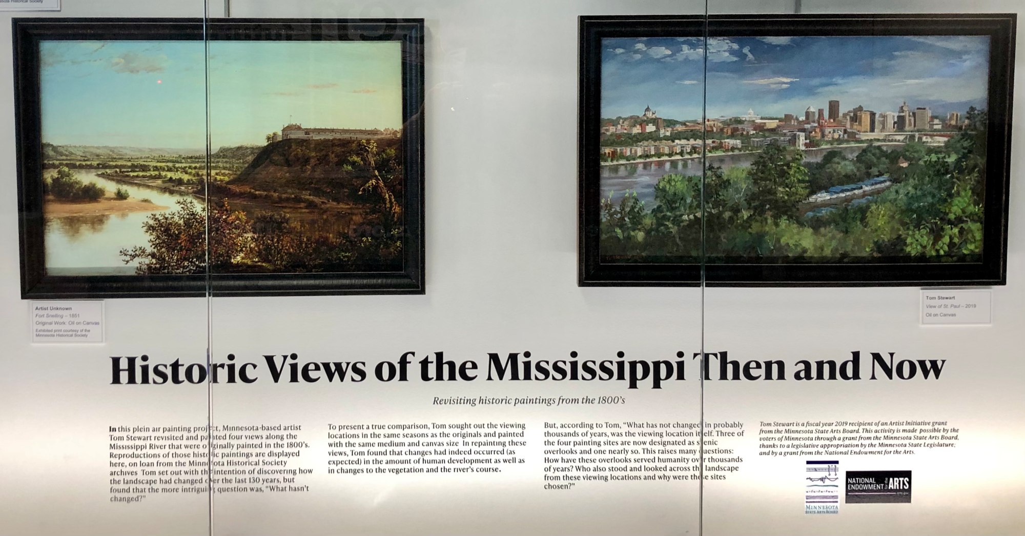 In this plein air painting project, Minnesota-based artist Tom Stewart revisited and painted four views along the Mississippi River that were originally painted in the 1800’s. Reproductions of those historic paintings are displayed here, from the Minnesota Historical Society archives. Tom set out with the intention of discovering how the landscape had changed over the last 130 years, but found that the more intriguing question was, “What hasn’t changed?”