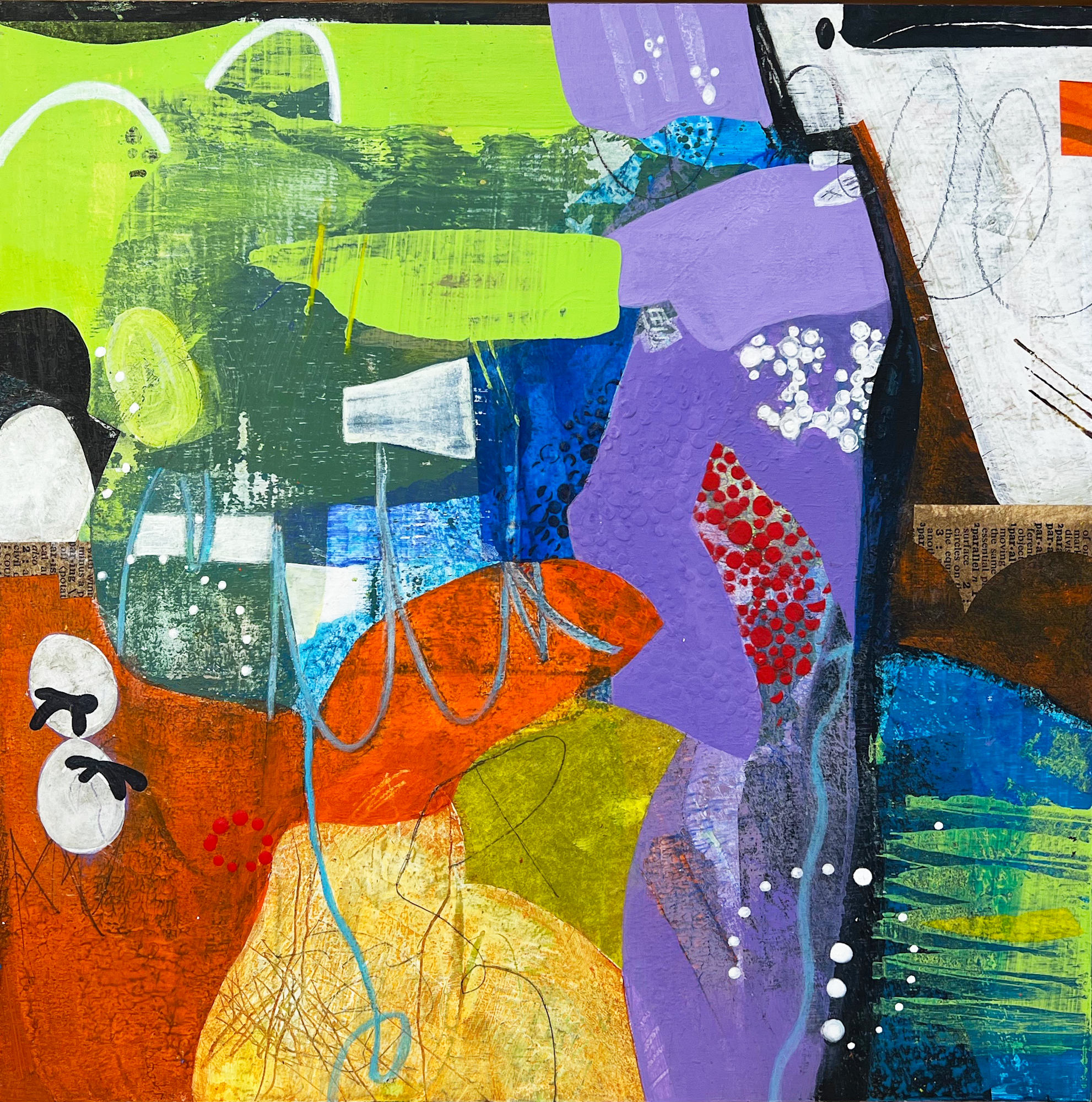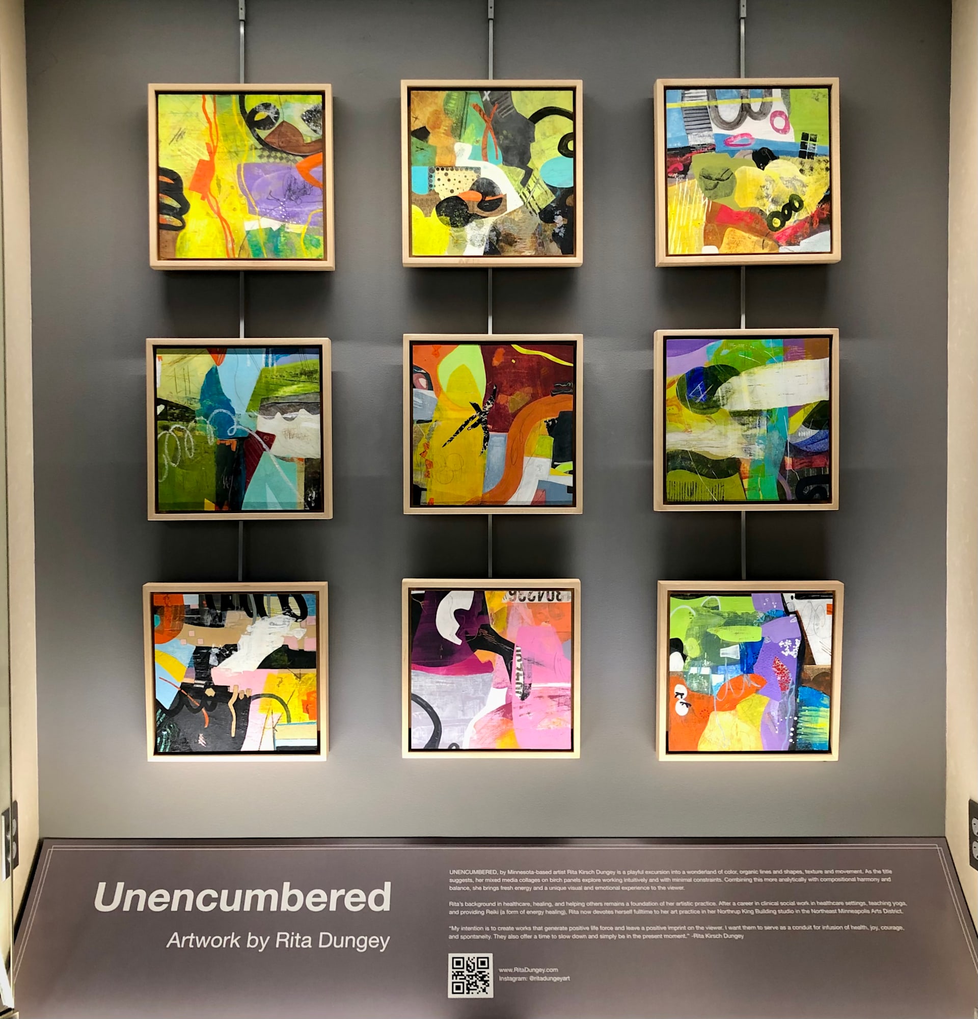 Unencumbered, by Minnesota-based artist Rita Kirsch Dungey is a playful excursion into a wonderland of color, organic lines and shapes, texture and movement. As the title suggests, her mixed media collages on birch panels explore working intuitively and with minimal constraints. Combining this more analytically with compositional harmony and balance, she brings fresh energy and a unique visual and emotional experience to the viewer.