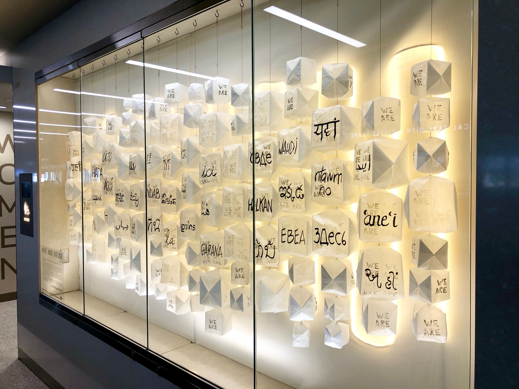 As a linguist, translator and lifetime collector of words, I wanted to capture this vibrant, ever-changing linguistic landscape and celebrate it in the shape of glowing language orbs. Folded out of tracing paper, hand-printed and hand-lettered, each orb represents a linguistic community present in this part of the world.