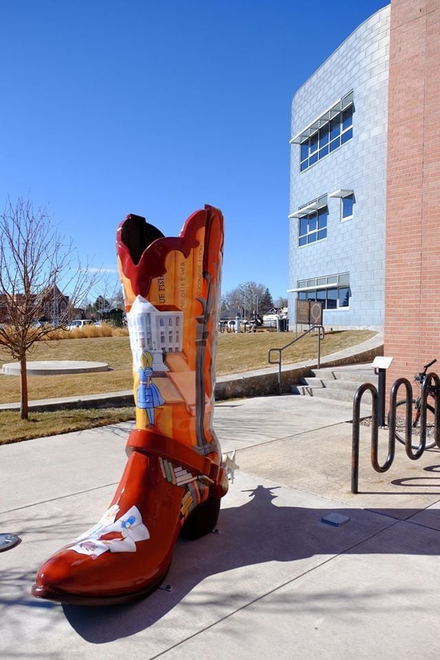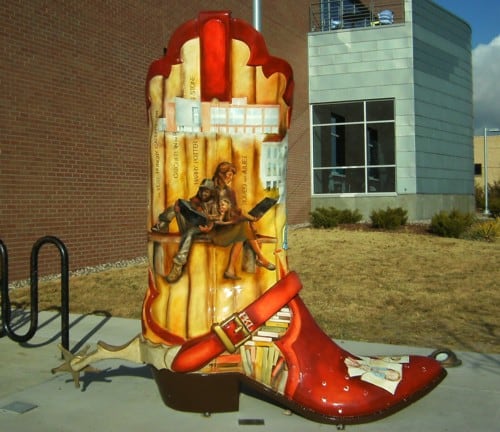 The Book Boot was created as part of "These Boots Are Made for Talking" and is installed outside the Laramie County Library on the south side of the building. The Big Boots Initiative is a joint public art project of the Cheyenne Depot Museum Foundation and the Cheyenne Downtown Development Authority.