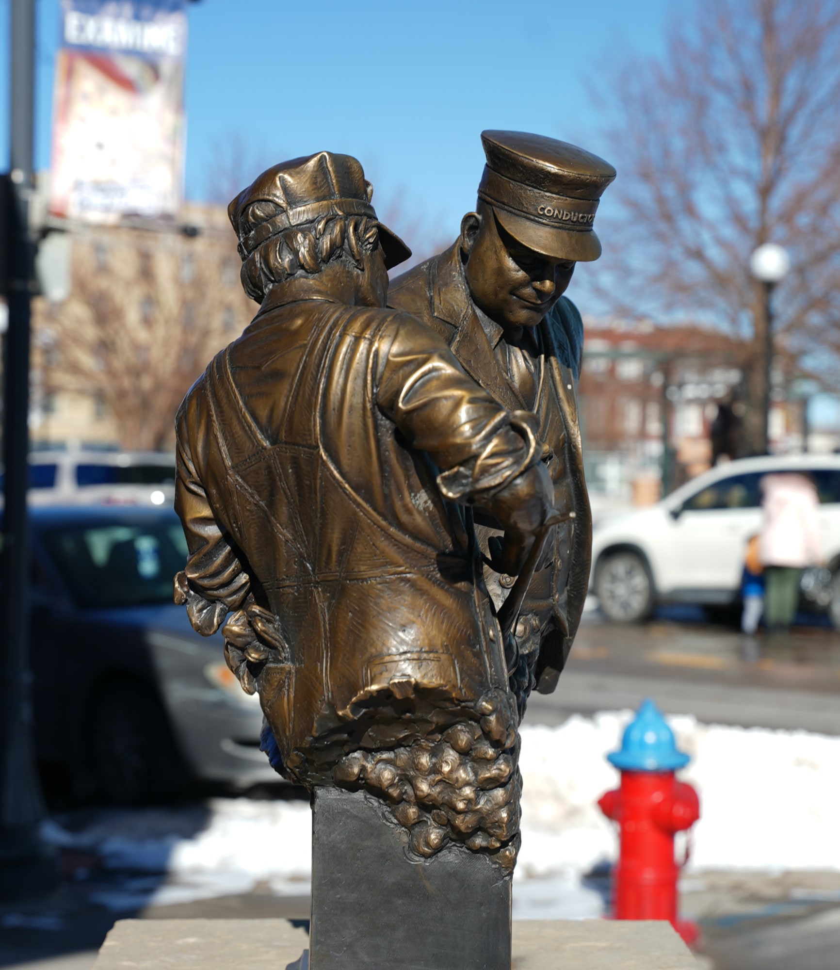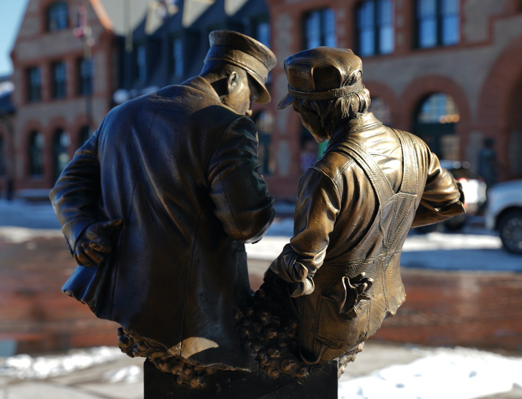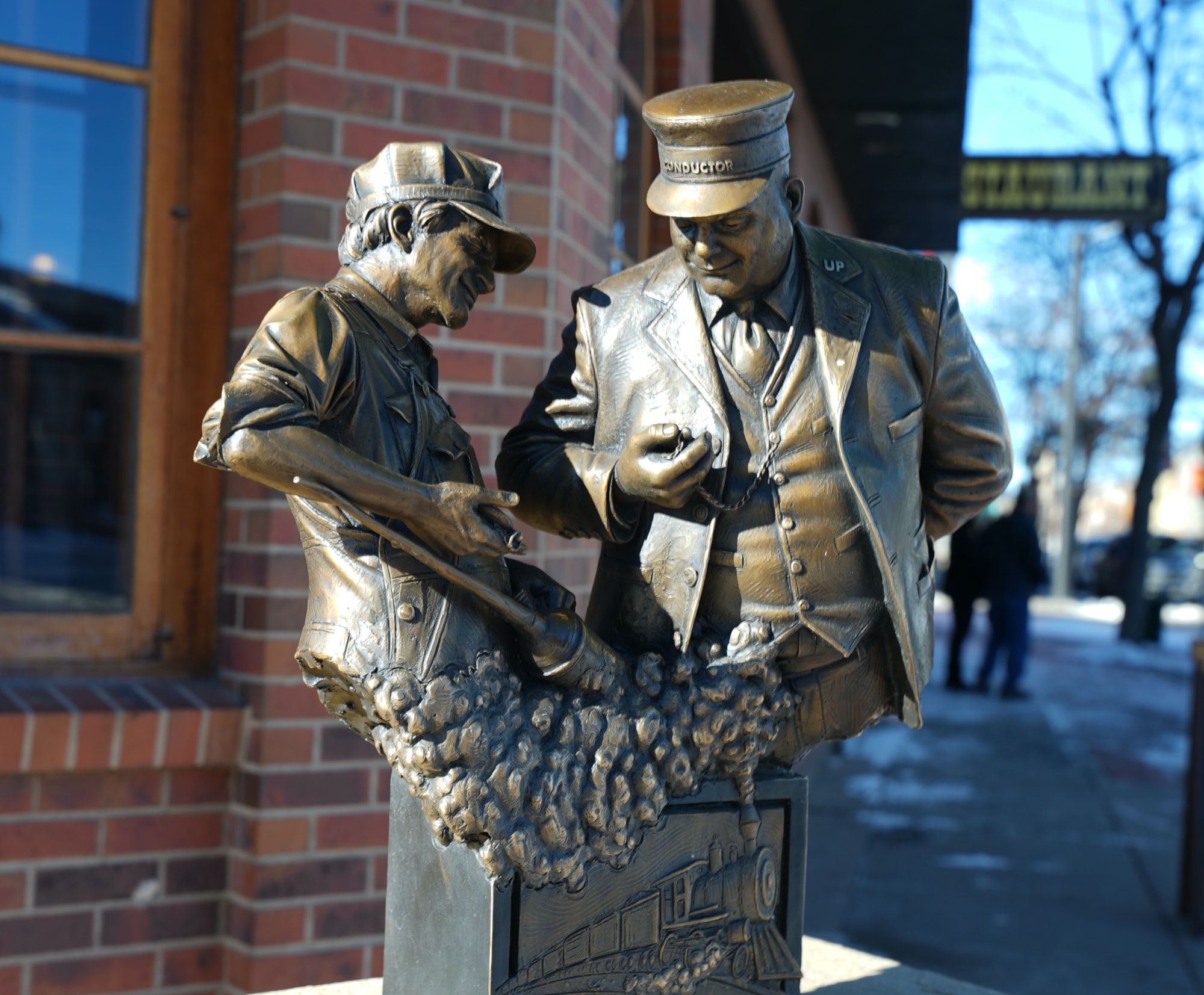 The statue he donated depicts two railroad workers looking at their watches, comparing time. It invites the viewer back into another, older world where tasks like keeping synchronizing time was not controlled by anonymous computers but by vigilant men and women.
