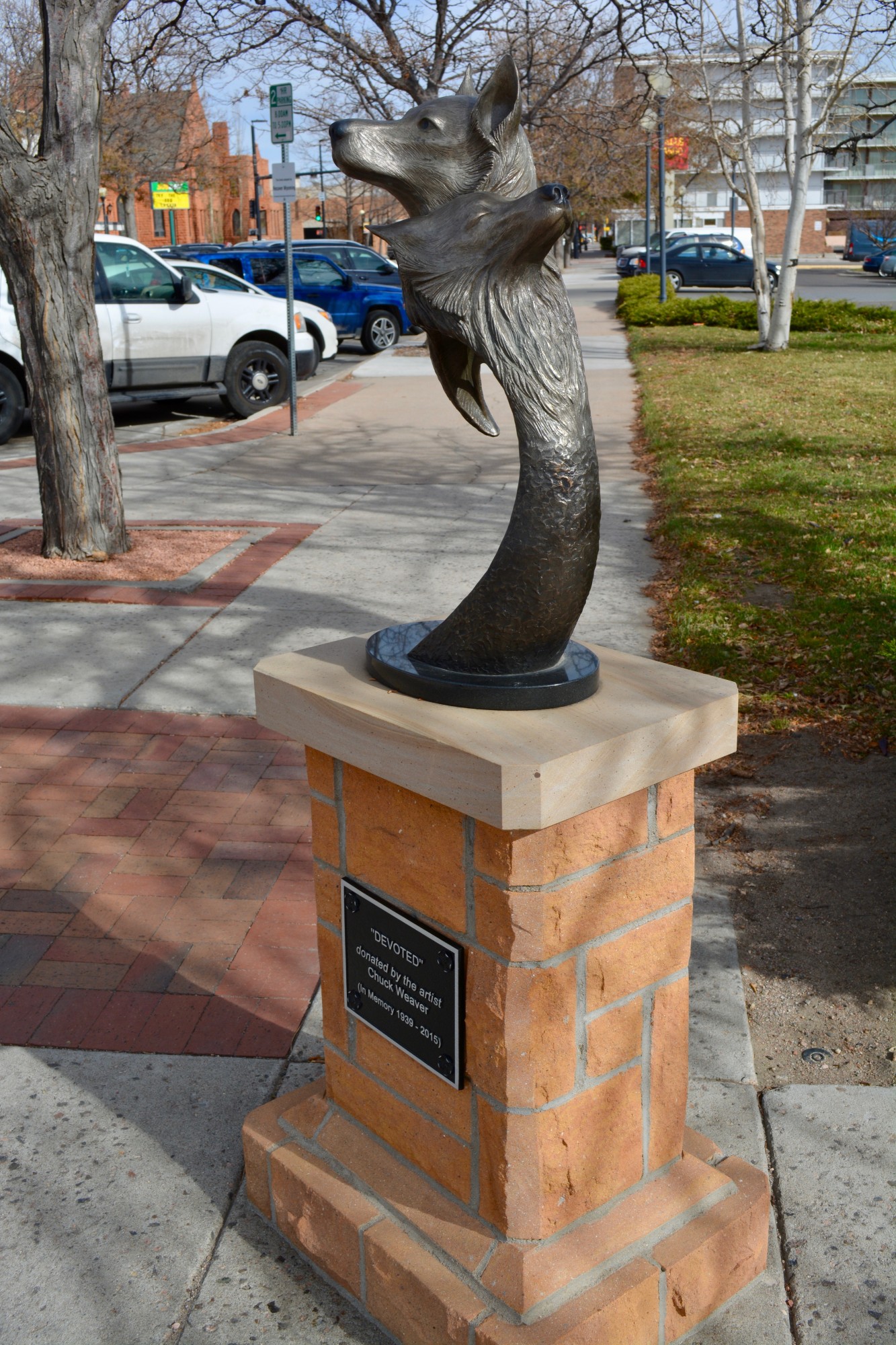 “About the time I did this sculpture (Devoted) there was a lot of discussion regarding the re-introduction of wolves, about their being an endangered or not, their impact on the area, etc. Reading about the species, I learned they are considered monogamous, dedicated to one mate. I chose to depict this pair expressing that bond. Perhaps its placement here also references my bond to 18th Street.”