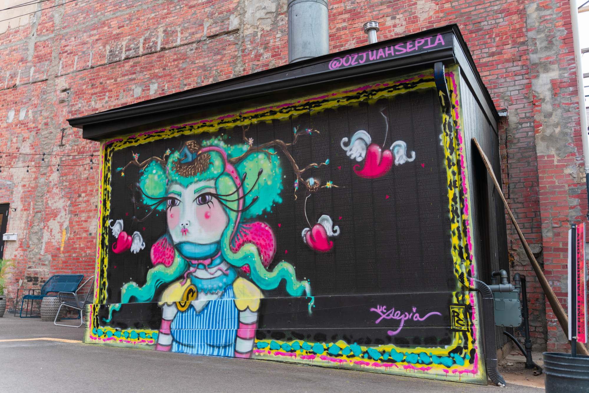 This mural is on the back wall of the Paramount Building at 1607 Capital Ave and was created as part of the Paint Slingers initiative.