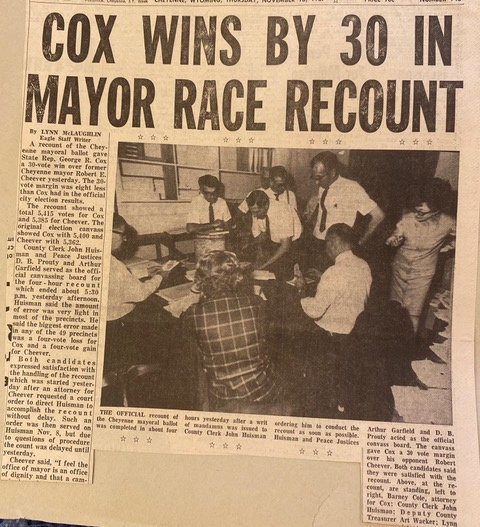 "George Robert Cox and Patricia Joder Cox were childhood friends who, during high school at Cheyenne High, had a moment when they realized that their dreams should be fulfilled together. After college, they married and moved to California for George's military training. They returned to fulfill his service at F.E. Warren Air Force Base. They had two children. Patricia taught school at Churchill Elementary. George co-owned Western Skies Motel on Lincolnway. In 1960, at the age of 28, George was elected to the Wyoming House of Representatives and served until his death. At age 35, he was elected Mayor of Cheyenne. George chaired the committee to establish Laramie County Community College and ushered its authorization through the State Legislature. He led the development of the Cheyenne Civic Center complex, centered on this corner of Pioneer Avenue and 20th Street. George served Cheyenne until his untimely death in 1969 at age 37 during his first term as Mayor. Patricia lived a full life as a dedicated educator and a beloved mother and grandmother, dying in 2021 at the age of 88. They are at rest together in Cheyenne."
