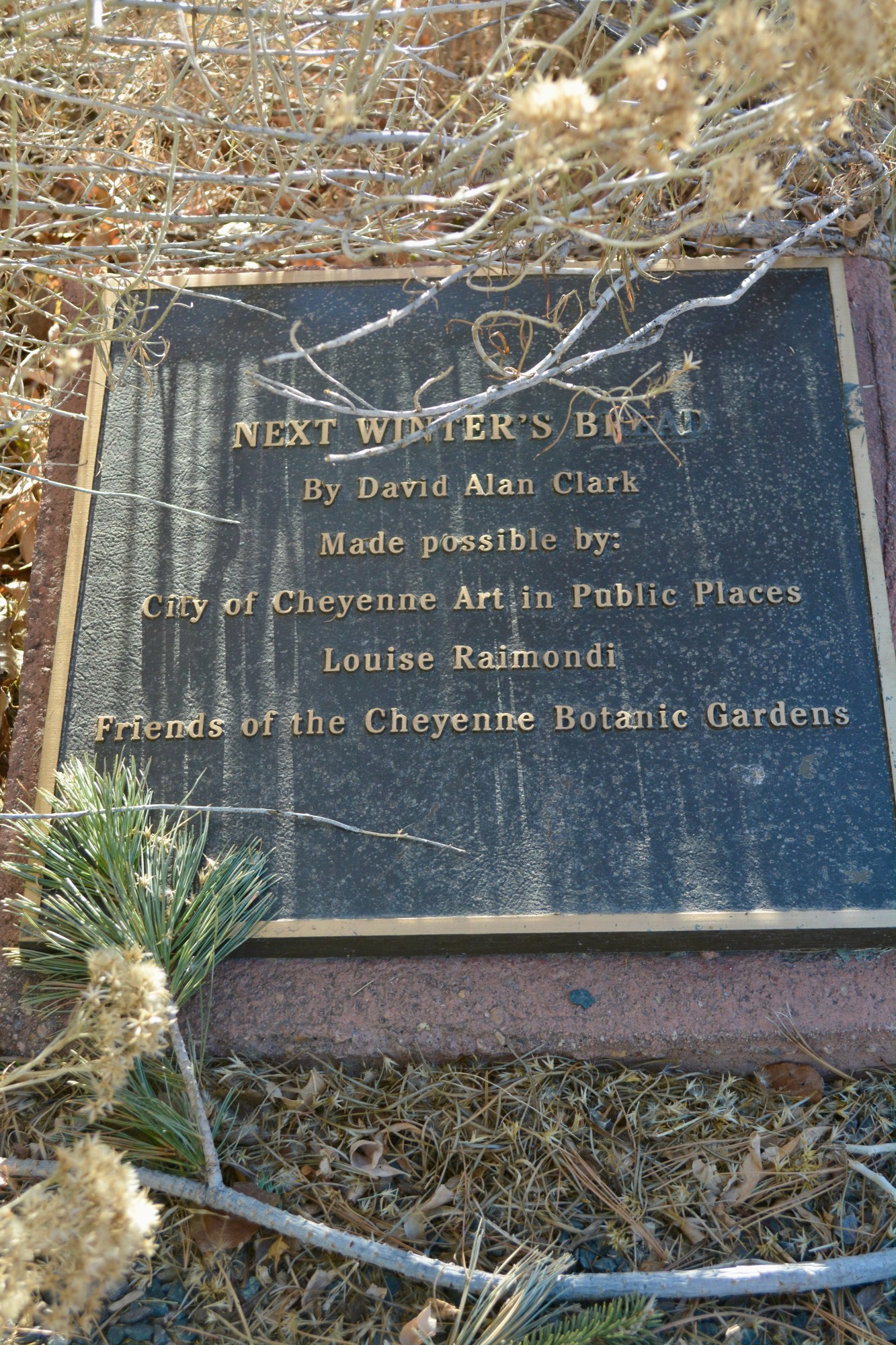 "Next Winter's Bread" is a small bronze monument installed in the 1800's Garden, just north of the Cheyenne Botanic Gardens. This piece was an early purchase by the Art in Public Places program, with support from Louise Raimondi and the Friends of the Cheyenne Botanic Gardens.