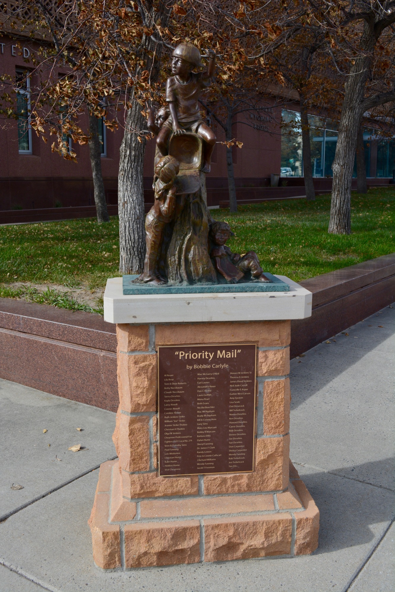 “Priority Mail” is a part of the Capitol Avenue Bronze public art collection . . donated to the City of Cheyenne by private individuals, organizations or companies. For more information about the Capitol Avenue Bronze Project, visit Deselms Fine Art at https://deselmsfineart.com