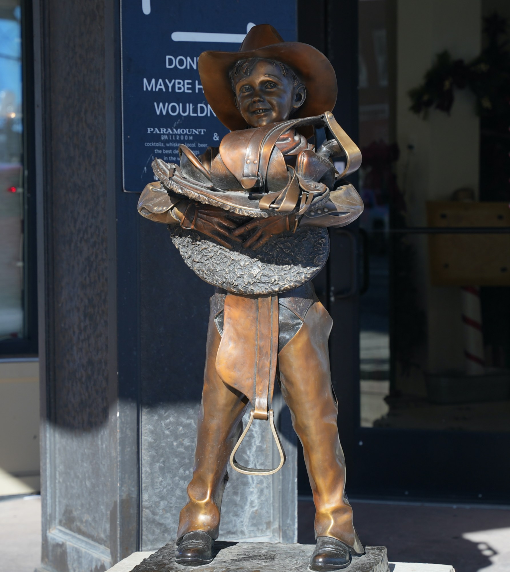 Rarin’ to Ride depicts a young boy grappling with a large saddle. He’s wearing a large hat and is eager to saddle up and ride into horizon on his own adventures. The statue captures the independent and exploratory spirit of the west. The boy, no doubt following in the footsteps of his father and grandfather, is eager to be a cowboy.