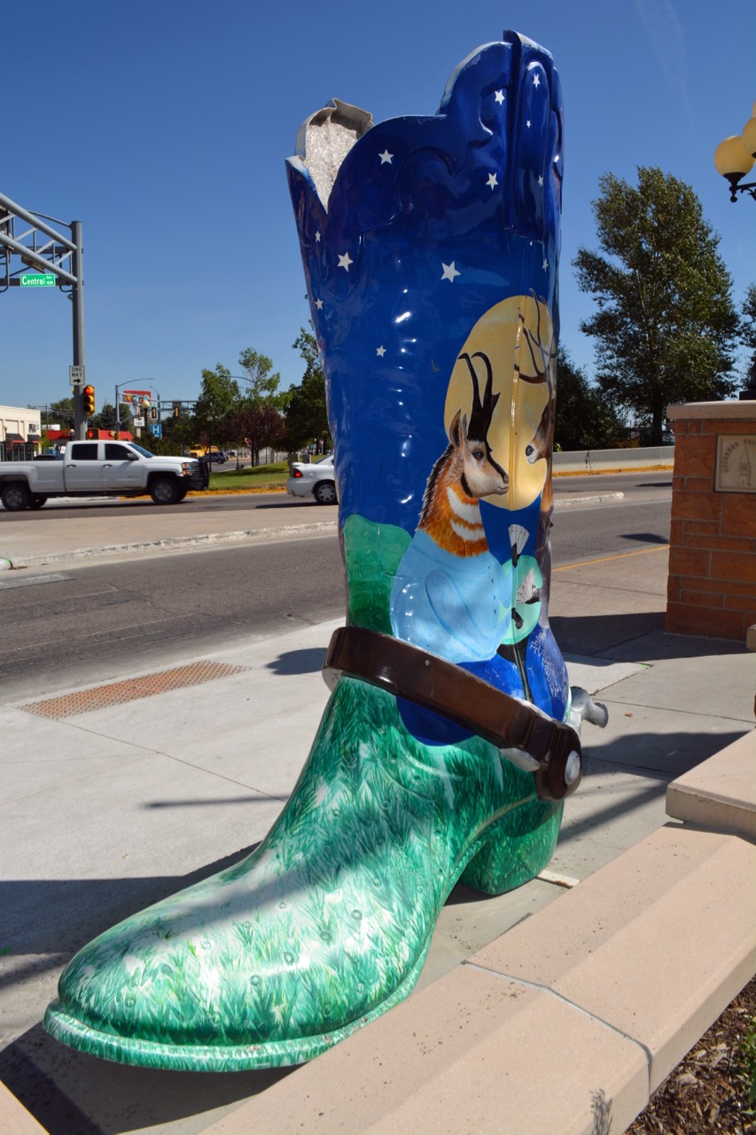 Where the Deer and the Antelope Play is part of the “These Boots are made for Talking” public art project started as a joint project of the Cheyenne Depot Museum Foundation and the Downtown Development Authority. The boots were sponsored by local businesses and auctioned at a fundraiser. The nearly $100,000 raised went to the Cheyenne Depot Museum Endowment Fund to benefit the museum. This boot is installed in the northeast corner of the Cheyenne Depot Plaza.