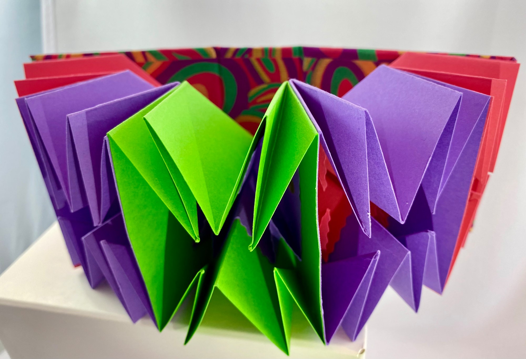 Double Turkish Fold Book, each fold with a contrasting color fold inside displaying two gold momi dots; a coordinating wrapper and tiny heart on the back. Indian cotton rag paper, Japanese momi paper, card stock.