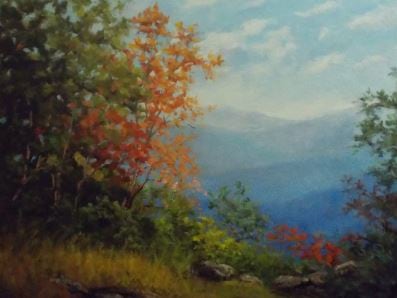 Living within two hours of the mountains, Off the Blue Ridge Parkway was inspired by one of my numerous hikes off the Parkway. As this was, many paintings have resulted from "misadventures," but all are inspired by the clear air, dappled light, and brilliant color.