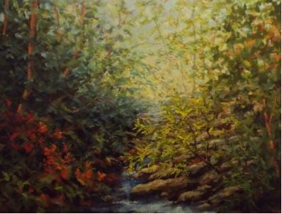 Living within two hours of the mountains, Off the Blue Ridge Parkway was inspired by one of my numerous hikes off the Parkway. As this was, many paintings have resulted from "misadventures," but all are inspired by the clear air, dappled light, and brilliant color.