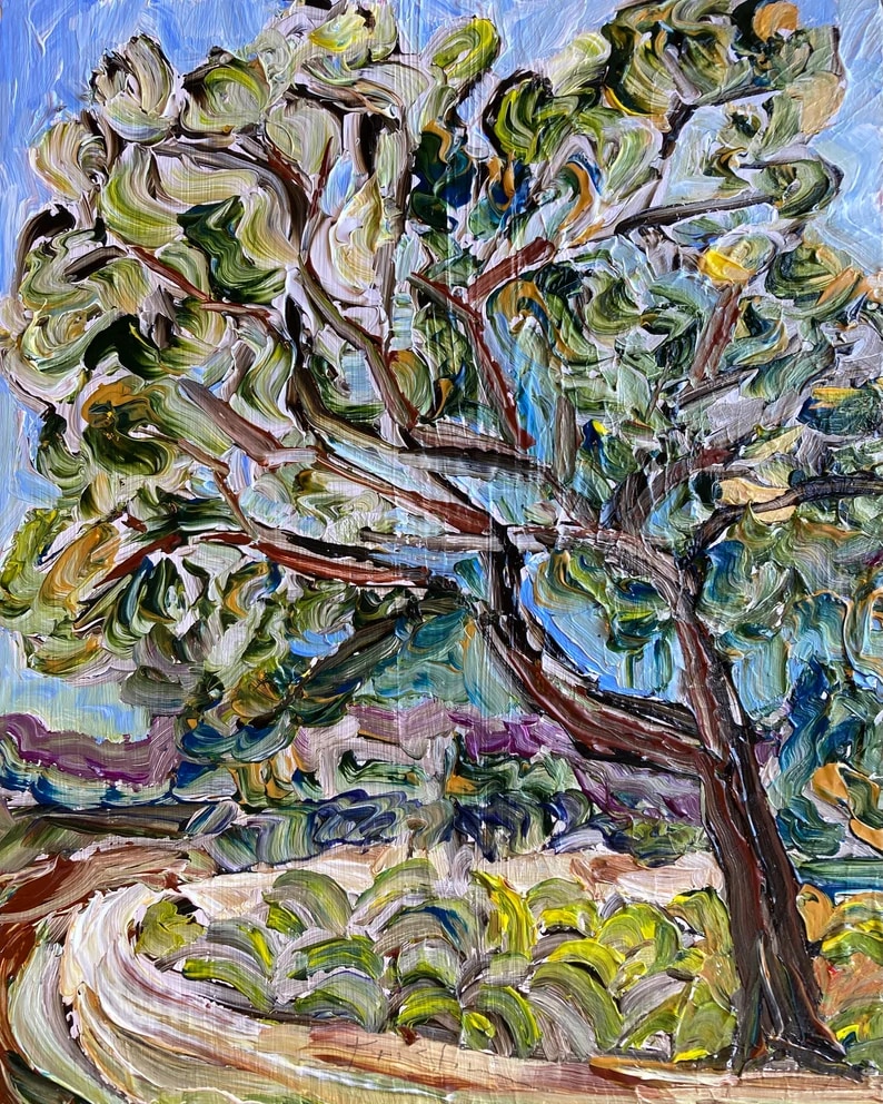 Original landscape painting by Kristin Gibson on a cradled deep profile birch and poplar panel. A painterly version of an old growth oak surrounded by ferns enjoyed while walking in gorgeous Duke Gardens at Duke University.