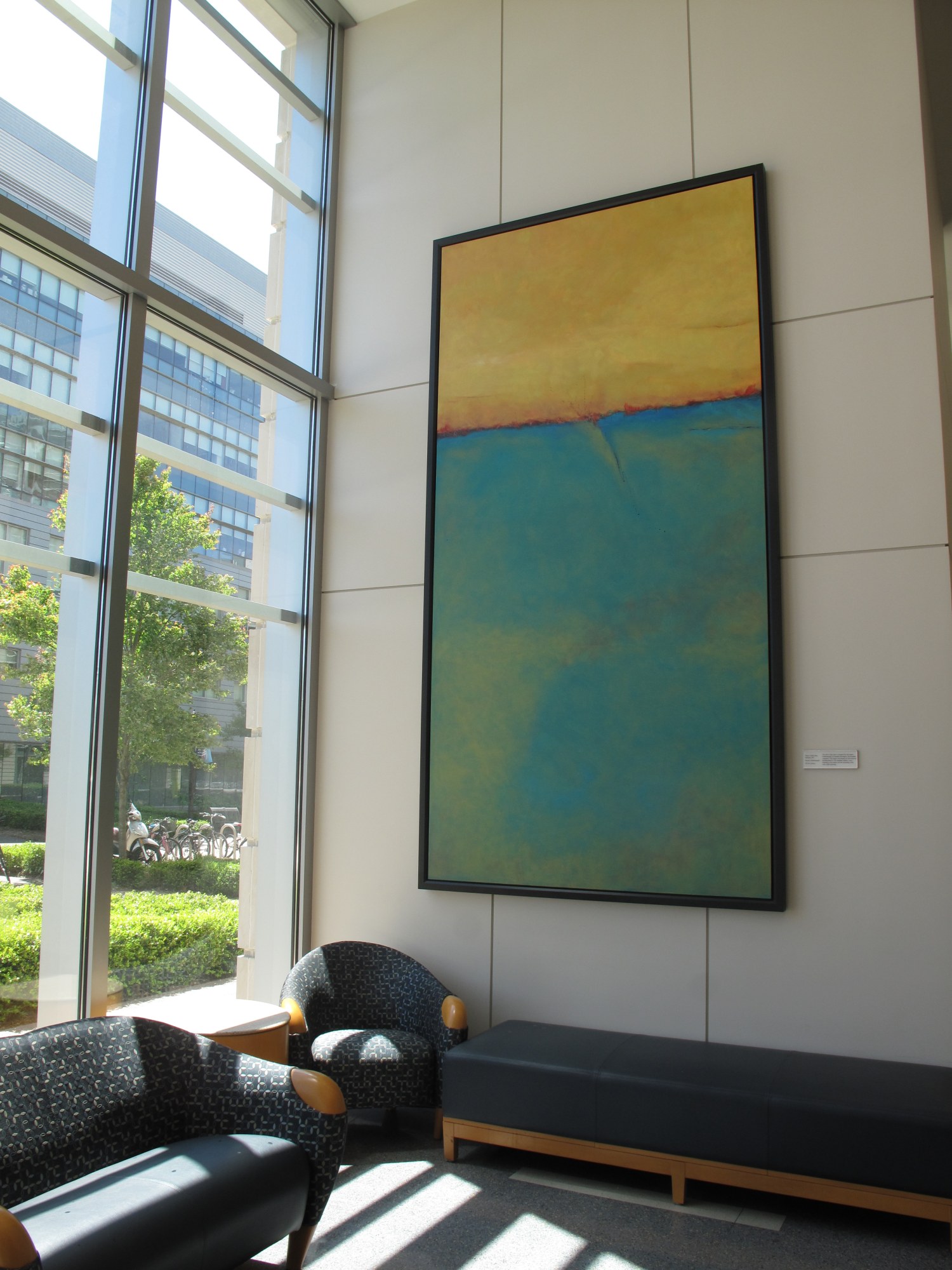 - Subject Matter: yellow and green with red line [CR]Mixed media & Acrylic, not oill. Artist confirmed that information after a visit and saw the plaque. 4/13/2016