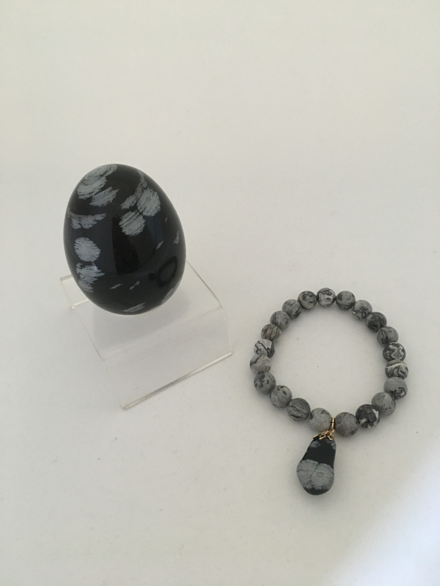 (Bracelet is displayed with hen-sized 58mm polished snowflake obsidian egg for $65. Polished in Germany. Sold separately.)