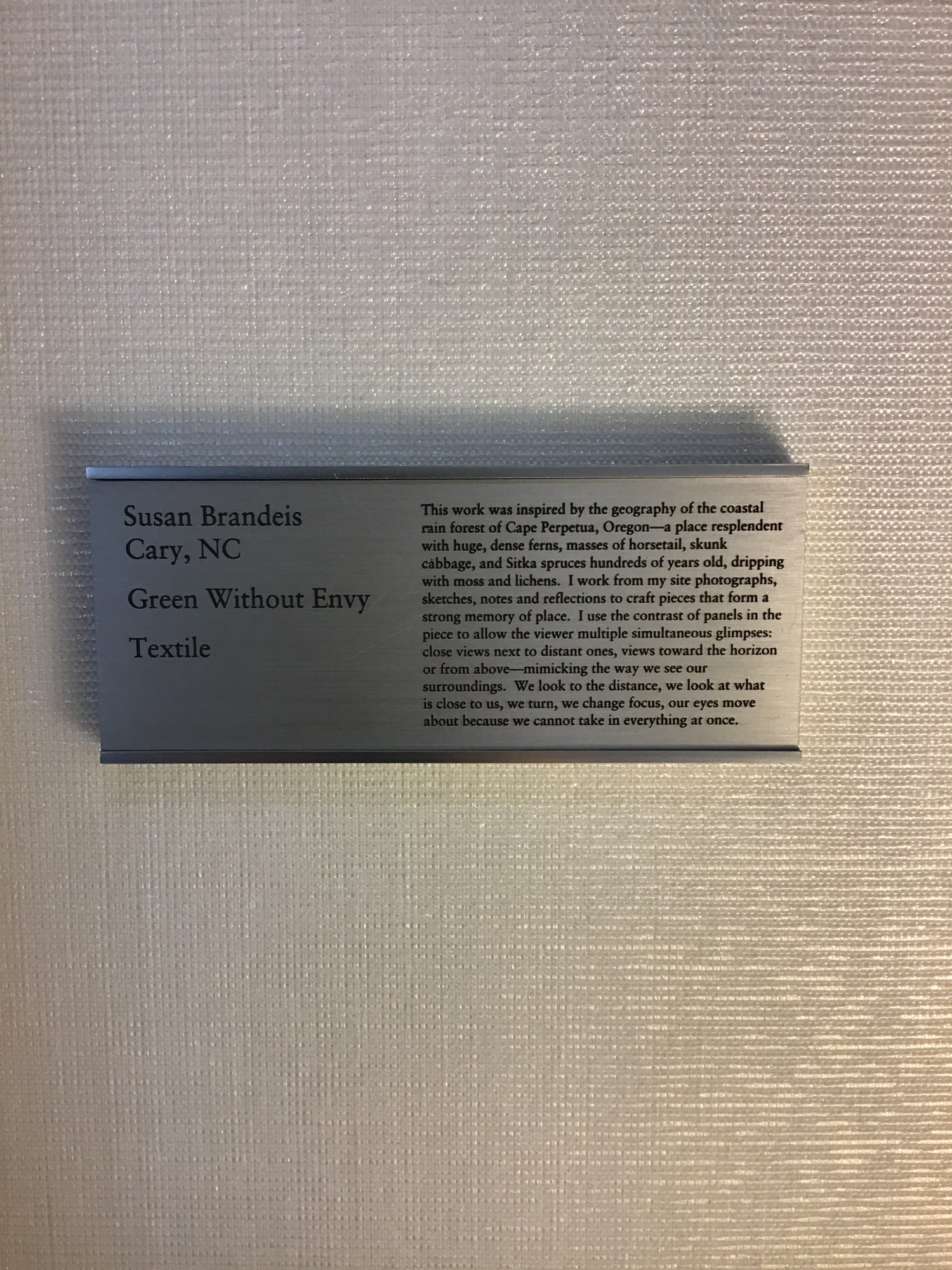 This textile artwork was inspired by plant life (horsetails, clover, tree bark) observed and photographed during my field work in the rain forest at Cape Perpetua, Oregon. I selected, enlarged, and digitally printed my photographs onto several types of fabric, then joined panels of the printed fabrics to depict the many contrasting greens in the landscape. Because of the abundant rainfall and gentle climate, many kinds of plants, also native to other parts of the US, grow to “super-size” and crowd densely under the exceptionally tall tree canopy. As a solitary hiker, I felt surrounded and enveloped in lush greenness, a feeling of enclosure I tried to convey with the close-up views of the plants.