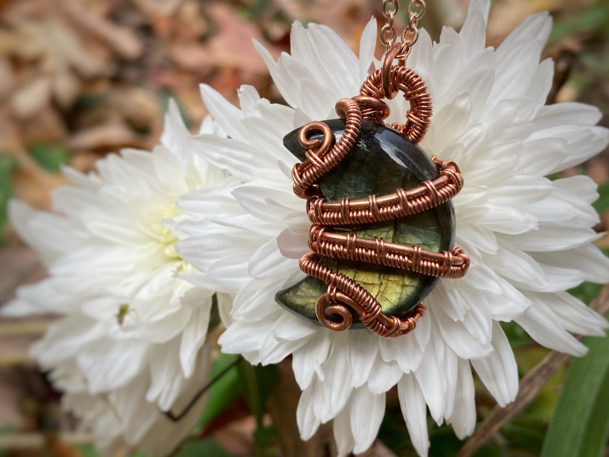 - Labradorite Moon in Bare Copper Wire with Stainless Steel Chain