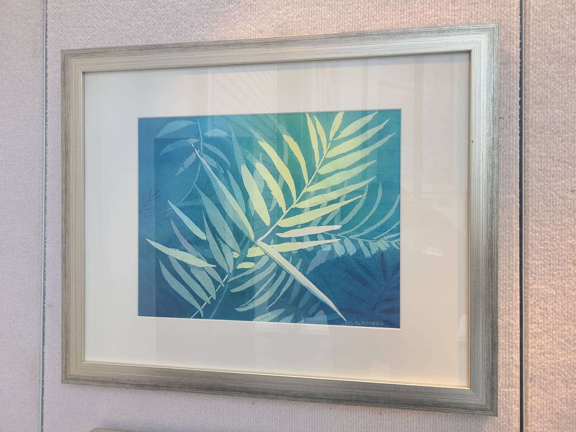 This particular color scheme is my favorite. I find it happy and relaxing. It was painted almost entirely in three colors. Matted and framed.